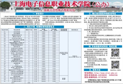 国家示范性骨干高职院校 一、学校简介 上海电子信息职业技术学院是一所近60年办学历史的公办全日制普通高等职业院校,培养电子信息、先进制造业、生产性服务业和城市服务业高素质技术技能型人才,是“国家示范性高等职业院校建设计划”骨干高职院校、上海市示范性高等职业技术院校、上海市职业教育先进单位,获“2012年全国职业院校魅力校园”、“全国社会扶贫先进集体”等荣誉称号,14年5月,荣获“第四届黄炎培职业教育优秀学校奖”,获“2018年亚太职业院校影响力50强”荣誉。 学校总部地处上海市奉贤区,占地400余亩,现有全日制在校生9288人。 三、确认报名信息和领取准考证 (一)考生按上海市教委的要求,在网上进行报名后,凡第一院校志愿报考我校的考生必须于4月20日9:00~14:00,到中山南二路620号我校徐汇校区确认报名信息,确认报名信息时不能更改志愿。 (二)确认报名信息时必须携带的材料: 1.考生本人身份证原件及复印件。 2.符合加分条件的证明原件和复印件,加分证明必须在现场确认报名信息时递交,过后不再受理。 3.网上报名流水号。 (三)领取准考证 考生必须按规定时间在网上足额缴纳报名及考试费,否则不得参加考试。 (四)到达我校徐汇校区的交通:轨道交通4号线(东安路站)、轨道交通7号线(东安路站)、轨道交通12号线(龙华中路站)、公交41路、104路等。 四、专业技能考试科目、考试日期 考生除了参加由上海市教育考试院组织的统一文化课考试外,凡第一院校志愿报考我校的考生,必须参加我校组织的专业技能考试。专业技能考试科目为: 报考艺术类专业:素描、色彩。报考非艺术类专业:应用文写作、计算机应用基础。 专业技能考试日期、考试地点见技能准考证。 五、联系方法 学校网址:http://www.st iei.edu.cn 招生咨询电话:64038240 54962336 招生监督电话:57132760 详情请参阅上海电子信息职业技术学院2019年面向中等职业学校应届毕业生招生简章。
