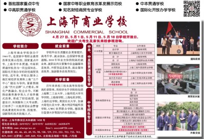 ● 首批国家重点中专 ● 国家中等职业教育改革发展示范校 ● 中本贯通学校 ● 中高职贯通学校 ● 知名财经商贸专业学校 ● 国际化开放办学学校 4月27日、5月1日、5月11日、5月18日学校开放日,欢迎广大考生及家长来校参观咨询。 学校简介 上海市商业学校创办于1960年,是国家中等职业教育改革发展示范校、国家重点中专、上海市中本贯通、中高职贯通学校。作为一所全国知名、国际化开放办学的财经商贸类学校,近年来,学校以服务上海区域经济发展和上海“五个中心”建设为导向,紧紧围绕上海“四大品牌”人才需求,深化产教融合、校企合作,不断推动教育教学和人才培养模式改革,形成了财经商贸、创意设计、休闲服务三大专业群,已培养了一大批深受社会赞誉的高素质的知识型、技能型、创新型的技术技能人才。 就业前景 学校毕业生质量社会美誉度好,高考升学、就业创业、出国留学渠道通畅。2018年毕业生保持较高的就业率,就职去向主要集中在金融服务系统类、外贸货运系统类、商业服务系统类、旅游服务系统类岗位。 升学前景 历年来我校三校生高考保持较高的录取率。我校学生升学院校包括上海第二工业大学、上海师范大学天华学院、上海商学院、上海电机学院、上海杉达学院、美国东北大学、加拿大哥伦比亚大学、澳大利亚科庭科技学院、UWC世界联合学院、德国奥尔登堡大学等国内外知名院校。 校址:上海市静安区共和新路1458号 招生咨询电话:26101021/ 26101019/ 66305225/ 66305479 官方网站:www.shangxiao.cn Email:scszsb@126.com 交通线路:40、46、65、69、95、98、108、129、210、 253、702、722、743、829、840(北罗线)、849、869、924、北安线及地铁一号线、八号线