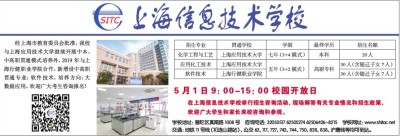 经上海市教育委员会批准,我校与上海应用技术大学继续开展中本、中高职贯通模式培养外,2019年与上海行健职业学院合作,新增设中高职贯通专业:软件技术,培养方向:大数据应用。欢迎广大考生咨询报名! 5月1日9:00-15:00校园开放日 在上海信息技术学校举行招生咨询活动,现场解答有关专业情况和招生政策,欢迎广大学生和家长来校咨询和参观。 学校地址:普陀区真南路1008号 咨询电话:32050517 62505274 62506426-8215 学校网址:www.shitac.net 交通:地铁11号线(祁连山路站)、公交62、117、727、742、744、750、828、838、沪唐线等均可到达。