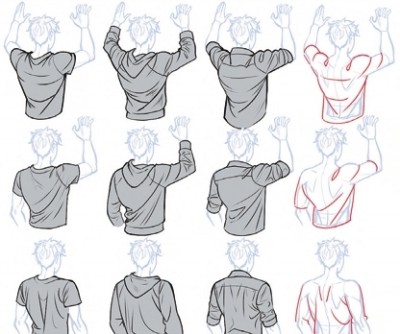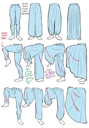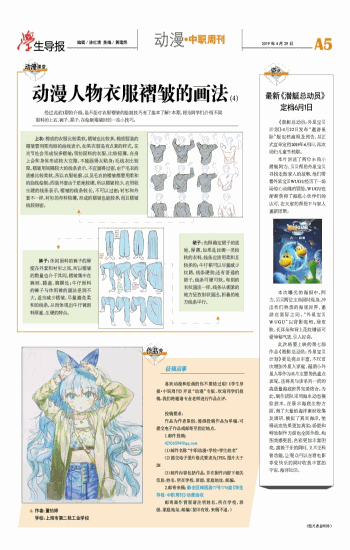 经过此前3期的介绍,是不是对衣服褶皱的绘制技巧有了基本了解?本期,将为同学们介绍不同面料的上衣、裤子、裙子,在绘制褶皱时的一些小技巧。 上衣:棉质的衣服比较柔软,褶皱也比较多。棉质服装的褶皱要用柔而细的曲线表示,如果衣服是有点紧的样式,在关节处会形成很多褶皱;雪纺面料的衣服,比较轻薄,在身上会和身体形成较大空隙,不能画得太贴身;毛线衣比较厚,褶皱用间隔较大的线条表示,不宜画得过密,由于毛衣的质感比较柔软,所以衣服轮廓,以及毛衣的褶皱都要用柔和的曲线绘制;西装外套由于质地较硬,所以褶皱较少,应用较生硬的线条表示,褶皱的线条较长,不可以过密;衬衫和外套不一样,衬衫的布料较薄,形成的褶皱也就较多,而且褶皱线较细密。 裤子:休闲面料的裤子的厚度在外套和衬衫之间,所以褶皱的数量也介于其间,褶皱集中在裤裆、膝盖、脚踝处;牛仔面料的裤子与休闲裤的画法差别不大,适当减少褶皱,尽量避免柔和的线条,从而体现出牛仔裤面料厚重、生硬的特点。 裙子:先得确定裙子的质地、厚薄,如果是丝绸一类较软的衣料,线条应该用柔和且较多的;牛仔裙可以尽量减少纹路,线条硬朗;还有普通的裙子,线条可硬可软。和别的衣纹画法一样,线条从绷紧的地方呈放射状画出,折叠的地方线条平行。