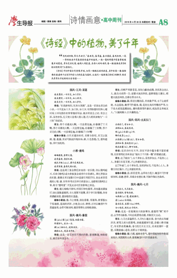 “东风动百物,草木尽欲言。”春林茂,春草盛,春水荡漾,春风和煦,一花一草的绽放中有春意徐徐盛开的盎然,一枝一蔓的舒展中有春景缓缓展开的葱茏。草木岂非无情,遍阅人间悲喜,在诗人的吟诵中,每一株植物在岁月的轮回里便有了立意恒久。 《诗经》作为中国古代诗歌开端,如同一幅幅生动的画卷,其中的每一株植物都承载着两千五百多年前人们的悲喜与感怀。让我们一起跟随《诗经》的脚步,俯首找寻草木中流转的古老诗意…… 国风·王风·采葛 彼采葛兮,一日不见,如三月兮。 彼采萧兮,一日不见,如三秋兮。 彼采艾兮,一日不见,如三岁兮。 诗说:“乐哉新相知,忧来生别离”,这是一首表达思念的小诗。一日不见如三月、如三秋、如三岁,采用物理时间和心理时间上时间差的有悖常理的写法,极言其思念之切,思念之深。虽然夸张,但又使人觉得入情入理,后人将其浓缩为“一日三秋”的成语。 译文:那个采葛的人啊,一天没看见她,好像隔了三月啊。那个采萧的人啊,一天没看见她,好像隔了三秋啊。那个采艾的人啊,一天没看见她,好像隔了三年啊! 植物小课堂:古代采葛供织布,采萧为祭祀,采艾以医病。葛,葛藤,其皮可制成纤维织布;萧,又名香蒿;艾,菊科植物,其叶供药用。 小雅·鹿鸣 呦呦鹿鸣,食野之蒿。 我有嘉宾,德音孔昭。 视民不恌(tiāo),君子是则是效。 我有旨酒,嘉宾式燕以敖。 诗说:这是周王宴会群臣宾客的一首乐歌,诗以鹿鸣起兴,后来《鹿鸣》成为贵族宴会或举行乡饮酒礼、燕礼等宴会的乐歌。曹操在其《短歌行》中直接引用前四句,表达求贤若渴的心情。唐、宋科举考试后举行的宴会上,也歌唱《鹿鸣》之章,称为“鹿鸣宴”,可见此诗对后世影响之深远。 译文:鹿儿呦呦不停叫,呼朋引伴吃蒿草。我有嘉宾满客厅,谈吐高雅道理明。示人宽厚不轻薄,君子学习好楷模。我有美酒献宾朋,嘉宾畅饮乐盈盈。 植物小课堂:蒿:今之青蒿,别名香蒿、草蒿等。常零散生于低海拔、湿润的河岸、沙地及山谷,路旁,古时以嫩苗叶作菜蔬食用,全草可做饲料,鹿类等野生动物较喜食。 国风·秦风·蒹葭 蒹(jiān)葭(jiā)苍苍,白露为霜。 所谓伊人,在水一方。 溯(sù)洄从之,道阻且长。 溯游从之,宛在水中央。 诗说:这是一首写求而不得的诗歌,意境飘逸,神韵悠长,被后世吟诵至今。 译文:河畔芦苇碧苍苍,深秋白露结成霜。我所思念的人儿,就在水的那一方。逆着水流沿岸找,道路艰险又漫长。顺着水流沿岸找,仿佛在那水中央。 植物小课堂:蒹:即没长穗的荻。形状像芦苇,生于山坡草地、水边湿地。嫩芽可作蔬食。葭:是初生尚未秀穗的芦苇,生于浅水或低湿潮润处。蒹和葭常用作谦词,或指思念异地友人。“人随鸿雁少,江共蒹葭远。” 国风·郑风·出其东门 出其东门,有女如云。 虽则如云,匪我思存。 缟(gǎo)衣綦(qí)巾,聊乐我员(yún)。 出其闉(yīn)闍(dū),有女如荼。 虽则如荼,匪我思且(jū)。 缟衣茹藘(lǘ),聊可与娱。 诗说:这首诗朴实无华,却在平淡中蕴含着丰富的感情。后世常用此诗来表达“弱水三千只取一瓢”的情感态度。 译文:出了城东门,女子多如云。虽然多如云,不是我心上人。身着白衣苍艾裙,才让我感到亲近。 出了外城门,女子多如花。虽然多如花,不是我心上人。身着白衣红佩巾,才让我感到欢欣。 植物小课堂:荼:即苦苣菜,全草有白乳汁,嫩茎叶可作青绿饲料。茹藘:茜草,其根含有茜红素,可制作绛红色染料。 国风·豳风·七月 七月流火,九月授衣。 春日载阳,有鸣仓庚。 女执懿(yì)筐,遵彼微行,爰(yuán)求柔桑。 春日迟迟,采蘩(fán)祁祁。 女心伤悲,殆及公子同归。 诗说:这是一首规模宏大的叙事诗,通篇用“赋”的手法,以节序为脉络,不时出现景物点缀,形象而又生动。 译文:七月火星偏西方,九月叫人缝衣裳。春天的太阳暖洋洋,黄莺儿枝头把歌唱。姑娘提着深竹筐,沿着小路采摘忙,专采那些柔嫩桑。春日的白天长又长,采来的蒿叶一筐筐。采蒿姑娘心悲伤,怕那公子将我抢。 植物小课堂:蘩:白蒿,植株有香气,据中国植物物种数据库统计,我国蒿类众多,蒌蒿嫩茎叶可作菜蔬食用。