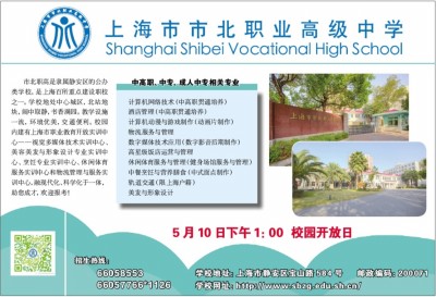 市北职高是隶属静安区的公办类学校,是上海百所重点建设职校之一。学校地处中心城区,北站地块,闹中取静,书香满园。教学设施一流,环境优美,交通便利。校园内建有上海市职业教育开放实训中心——视觉多媒体技术实训中心、美容美发与形象设计专业实训中心、烹饪专业实训中心、休闲体育服务实训中心和物流管理与服务实训中心,融现代化、科学化于一体,助您成才,欢迎报考! 中高职、中专、成人中专相关专业 计算机网络技术(中高职贯通培养) 酒店管理(中高职贯通培养) 计算机动漫与游戏制作(动画片制作) 物流服务与管理 数字媒体技术应用(数字影音后期制作) 高星级饭店运营与管理 休闲体育服务与管理(健身场馆服务与管理) 中餐烹饪与营养膳食(中式面点制作) 轨道交通(限上海户籍) 美发与形象设计 5月10日下午1:00 校园开放日 招生热线: 66058553 66057766*1126 学校地址:上海市静安区宝山路584号 邮政编码:200071学校网址:http://www.sbzg.edu.sh.cn/