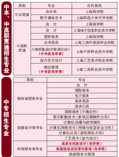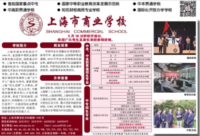 ● 首批国家重点中专 ● 国家中等职业教育改革发展示范校 ● 中本贯通学校 ● 中高职贯通学校 ● 知名财经商贸专业学校 ● 国际化开放办学学校 5月18日学校开放日,欢迎广大考生及家长来校参观咨询。 学校简介 上海市商业学校创办于1960年,是国家中等职业教育改革发展示范校、国家重点中专、上海市中本贯通、中高职贯通学校。作为一所全国知名、国际化开放办学的财经商贸类学校,近年来,学校以服务上海区域经济发展和上海“五个中心”建设为导向,紧紧围绕上海“四大品牌”人才需求,深化产教融合、校企合作,不断推动教育教学和人才培养模式改革,形成了财经商贸、创意设计、休闲服务三大专业群,已培养了一大批深受社会赞誉的高素质的知识型、技能型、创新型的技术技能人才。 就业前景 学校毕业生质量社会美誉度好,高考升学、就业创业、出国留学渠道通畅。2018年毕业生保持较高的就业率,就职去向主要集中在金融服务系统类、外贸货运系统类、商业服务系统类、旅游服务系统类岗位。 升学前景 历年来我校三校生高考保持较高的录取率。我校学生升学院校包括上海第二工业大学、上海师范大学天华学院、上海商学院、上海电机学院、上海杉达学院、美国东北大学、加拿大哥伦比亚大学、澳大利亚科庭科技学院、UWC世界联合学院、德国奥尔登堡大学等国内外知名院校。 校址:上海市静安区共和新路1458号 招生咨询电话:26101021/ 26101019/ 66305225/ 66305479 官方网站:www.shangxiao.cn Email:scszsb@126.com 交通线路:40、46、65、69、95、98、108、129、210、 253、702、722、743、829、840(北罗线)、849、869、924、北安线及地铁一号线、八号线