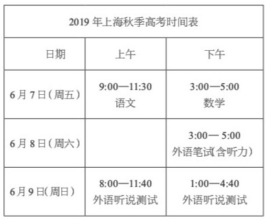 记者 刘昕璐 市教育考试院消息,2019年上海市普通高校招生统一文化考试将于6月7日、8日、9日进行。其中,根据教育部《关于做好2019年普通高校招生工作的通知》(教学〔2019〕1号)规定,语数外统考科目时间安排在7日、8日两天,外语听说测试将于9日进行。 6月7日上午9:00—11:30为语文科目考试,下午3:00—5:00为数学科目考试。6月8日下午3:00—5:00为外语笔试(含听力)。6月9日上午8:00—11:40、下午1:00—4:40为外语听说测试。 市教育考试院提醒,6月7日上午语文科目考试,8:30考生开始入场,9:15起禁止考生入场,11:00后考生可提前交卷出场。下午数学科目考试,2:30考生开始入场,3:15起禁止考生入场,4:30后考生可提前交卷出场。 6月8日下午外语科目考试,2:30考生开始入场,2:45起禁止考生入场,2:45开始分发答题纸,2:50开始试听,2:55开始分发试卷,3:00听力考试正式开始。4:30后考生可提前交卷出场。 6月9日外语听说测试,考生需根据听说测试准考证上考试场次提前40分钟到考点报到,提前30分钟进入准备室。考试从考生进入准备室开始,如考生没有在规定的时间进入准备室,不能参加该场次考试,必须听从考试工作人员指令,参加其他场次的考试并不得随意离开考点。