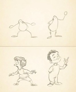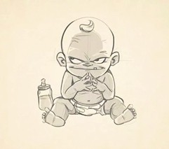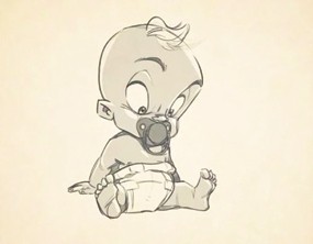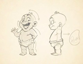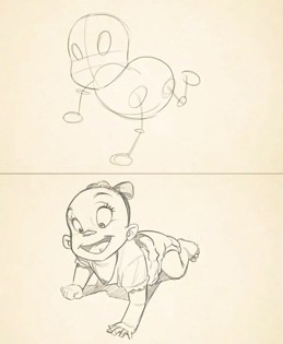 在卡通儿童绘图中广泛使用的另一种技术是关于头发的大小。 在绘画过程中,会根据文化和风格特征的不同而有所不同。有些艺术家喜欢绘制几条细致的线条来代表角色的头发,有的艺术家则会通过绘制头部周围的主要轮廓来表现儿童丰盈的发量。 婴儿的卡通头发绘制,会遵循称为梨形体或豆形体的惯例。绘制角色成功与否,取决于是否有把这些特征与圆形结合在一起的艺术能力。 如前所述,从出生到成年,人体的比例发生了巨大变化。小宝宝,尤其是新生儿,他们没有脖子,头部很大,没有牙齿,手臂和腿的尺寸几乎相同。 “脆弱”和“无辜”是这一婴儿生命时期的关键词。只有一颗牙齿(或没有牙齿)的婴儿更形象化。 婴儿的皮肤充满褶皱,仅仅是因为他们比成人更容易覆盖骨骼,这使得它们显得胖乎乎的很可爱。在绘制婴儿时,尝试使用更多圆形线而不是直线绘制草图: 虽然婴儿在现实生活中拥有非常小而闭合的眼睛,但在卡通形象中,他们的眼睛可以变大且非常富有表现力,以便更符合大脑袋的比例。 为你的角色赋予个性,你的艺术就越有效果和多样化。即使他们具有相同的年龄,也要始终寻找在角色之间的细微差别。