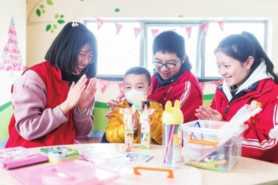 说明:作品中的小朋友位于画面中心,起到突出主体的作用。孩子虽然戴着口罩,但仍能通过他的双眼感受其成功搭建积木的喜悦;志愿者们鼓掌赞叹,脸上洋溢着微笑,让身处病房的孩子感受到满满的爱。