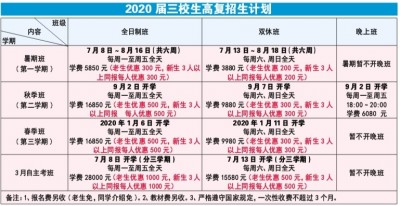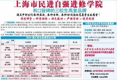 有口皆碑的三校生高复品牌 满足中职生们各种层次、各种目标、各种时间段的高复学生的愿望! 优秀师资+科学课程+特色教材+严格管理=优异成绩 质量稳定:师资队伍由上海从事三校生高复的优秀教师,《直击高考——语文、数学、英语》和《领航3月自主招生考复习丛书》的主编等名师组成。今年3月考有385名同学被各高校录取,5月考全日制班级全部上线。总分最高263分,语文70分以上共68位,数学90分以上共66位,英语80分以上共89位。(详细信息见学院网站、微信公众号)。 科学管理:学院进行统一制度管理,由各教研组长负责安排和监督统一的教学计划和内容。课时足,天天有作业,周周有测验,另有期中、期末考试和模拟考试。每班配一名资深专职班主任。一年中举办多次有特色的家长会。 中职生学业水平考冲优暑期班 (参加2019年底测试) 开设课程:语文、数学、英语(加口试)7月10日---8月19日(每周一、三、五上课) 学费:4280元(3人以上同报每人优惠200元,老生优惠200元) 预告: 6月15日、6月22日上午9点在徐汇日月光校区举行中职生高复大型咨询活动 咨询(上课)地点: 漕宝路33号(徐汇日月光A座5层)(铁1号、12号线漕宝路站均可直达) 咨询电话: 34197845 34197846 网址:www.mjzq.net 公众微信:mjzq1986