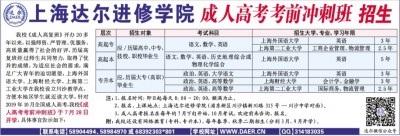 我校《成人高复班》开办20多年以来,以强师资、严管理、优服务、高质量赢得了社会的好评。历届高复班经过师生共同努力,取得了优异的成绩。为适应社会的需求,满足广大青年的迫切愿望,上海外国语大学、上海财经大学、上海第二工业大学在我校设立川沙教学点,方便本地区学生就近读大学。针对2019年10月全国成人高考,我校《成人高考考前冲刺班》于7月28日开学,具体事宜告示如下: 注:1、报名时间:即日起每天8:00~20:00,额满为止。 2、报名、上课地点:上海达尔进修学院(浦东新区川沙镇新川路315号--川沙中学对面)。 3、成人高考报名在每年的7月下旬开始,10月考试,欢迎前来咨询、报名。 附:我校还设有网络教育(专科、专升本),每年春季、秋季二期招生(分别3月、9月开学)。 【联系电话】58904494、58984970或68392303*801 【学校网址】WWW.DAER.CN 【QQ】314183035