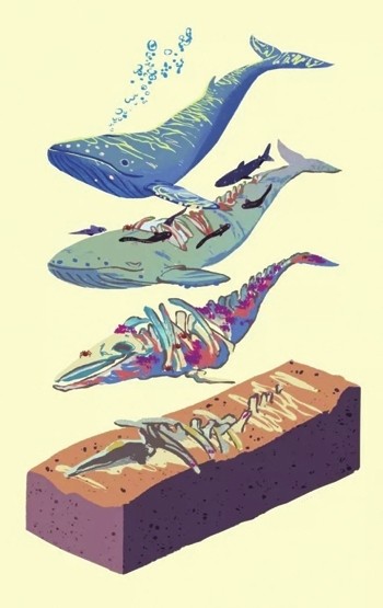 如果说鲸死亡后存有最“内核诗意”的话,那一定就是“鲸落”的整个过程。这具庞然大物近乎垂直而缓慢地沉入海底深处,其肉身在不同阶段甚至可以为此片海域提供长达100年的营养! 在1000多米深的地方,海底不仅寒冷、漆黑一片,而且海床表面基本是贫瘠的——直到一具尸体穿越水层着陆。它始于鲸在海面的最后一次呼吸,将两个世界连接了起来。任何尚未被鲨鱼或海鸟啄食的腐肉都为深海鲨鱼、鱼类和螃蟹等食腐动物提供了直接的食物。 研究人员估计,在很短的时间内(几周到几个月),这些生物就会剥光尸体的肉,只留下骨头。在深海海底,几乎没有洋流改变鲸骨的位置,使骨骼几乎保持着落入水底时的样子:颌骨靠近或直接与头骨相连,头骨自身则与脊柱呈一直线相连,鳍骨分列两边——假如这些部分没被海面上的食腐动物撕扯掉的话。 但是等海底食腐动物游走后,故事仍然没有结束。一旦肉被吃完,鲸落就步入第二阶段,迎来蜗牛、蛤蜊和多毛纲蠕虫在它身上的定居——其中一些以软骨和骨骼表面为食,另一些则钻入骨骼周围的沉积物中,这些沉积物因从鲸的油脂中渗出的有机物而变得更营养丰富。蜗牛、蛤蜊和多毛纲动物需要几个月到几年的时间来消耗它们所能消耗的一切,然后第三阶段开始,这一阶段可能持续几十年甚至更长时间(没人说得清,因为研究鲸落的时间只有40年)。这可能是最后的高潮阶段,在这一阶段中,两组细菌生活在鲸骨内或鲸骨之上:一组厌氧细菌利用海水中的硫酸盐消化锁在鲸骨中的油;另一组嗜硫细菌则利用厌氧细菌产生的硫化物副产物与溶解氧结合产生能量。 在这一阶段,嗜硫细菌会对各种真正的“鲸落专家”提供支持,包括一些贻贝、蛤蜊和管状蠕虫,嗜硫细菌在它们体内共生,使它们有机会在一个没有阳光的世界里自己产生能量。在这样的海洋深处,鲸的尸体给这个原本贫瘠的深海世界带来了第二次生命。 虽然这些海底骨骼的确切存续时间仍不得而知,但某些估测数据的上限表明,一具鲸尸可以提供长达100年的营养。