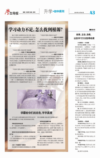 计划管理——有规律 长计划,短安排:在制定一个长期目标的同时,一定要制定一个短期学习目标,这个目标要切合自己的实际,通过努力是完全可以实现的。 最重要的是,能管住自己,也就挡住了各种学习上的负面干扰,如此,那个“大目标”也才会更接地气,这就是“千里之行,始于足下”。 挤时间,讲效率:要的是进行时间上的通盘计划,制定较为详细的课后时间安排计划表,课后时间要充分利用,合理安排,严格遵守,坚持下去,形成习惯。 计划表要按照时间和内容顺序,把放学回家后自己的吃饭、休息、学习时间安排一下,学习时间以45分钟为一节,中间休息10分钟,下午第四节若为自习课也列入计划表内。 预习管理——争主动 读:每科用10分钟左右的时间通读教材,把不理解的内容记录下来,这是你明天上课要重点听的内容。预习的目的是要形成问题,带着问题听课,当你的问题在脑中形成后,第二天听课就会集中精力听教师讲这个地方。所以,发现不明白之处你要写在预习本上。 写:预习时将模糊的、有障碍的、思维上的断点(不明白之处)书写下来。读写同步走。 练:预习的最高层次是练习,预习要体现在练习上,就是做课后能体现双基要求的练习题1到2道。做题时若你会做了,说明你的自学能力在提高,若不会做,没关系,很正常,因为老师没讲。 作业管理——要自律 不计时不作业:限时作业,记录作业时间,与作业无关的事什么也不做。比如:20分钟写完英语;25分钟写完数学…… 不复习不作业:先复习所学的内容,然后做作业。 遇到难题,百思不得,先放过,后攻坚。 不检查不作业:作业完成后必须检查一遍。 不小结不作业:写完作业后,告诉自己学会了什么,得到了什么,有什么体会。 独立做作业忌抄袭。