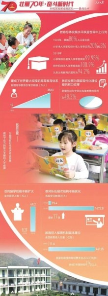 70年教育改革发展波澜壮阔,为经济社会持续健康发展作出了基础性、全局性、先导性贡献,总体水平跃居世界中上行列,我国实现了从人口大国向人力资源大国的转变。 70年教育事业发展进步,教育发展成果更多更公平惠及全体人民。抬高底部、缩小差距、提升质量,亿万孩子同在蓝天下共享优质教育、通过知识改变命运。 当越来越多的山里娃走出大山,走进心仪的高等学府;当越来越多的农村学校成为当地最美丽的风景;当越来越多的残疾孩子和健康孩子一道接受教育;当贫困家庭学生不再为学费、生活费而担忧…… 一张张朝气蓬勃的笑脸、一双双充满期待的眼睛背后,是国家教育事业的发展进步。教育事业取得的历史性成就、发生的历史性变革,为世界瞩目。 70年教育改革发展波澜壮阔,为经济社会持续健康发展作出了基础性、全局性、先导性贡献,总体水平跃居世界中上行列,我国实现了从人口大国向人力资源大国的转变。 70年的不懈奋斗特别是40多年的改革开放,全民族的思想道德素质和科学文化素质全面提升,成为全世界规模最大、发展速度最快、发展潜力最大、特色最为鲜明的教育。 抚今追昔,方知来路之多艰。 曾几何时,在很多地方,教育还是民生短板;曾几何时,多少孩子还因为家庭贫困失学;曾几何时,义务教育区域、城乡和校际之间还存在鲜明的“鸿沟”;曾几何时,走出大山考上大学,对很多孩子来说还只能是遥远的梦想…… 今日中国,同在蓝天下共享优质教育,让每个人都有人生出彩的机会,不再是遥不可及的梦想,而是最真切的获得感、幸福感、安全感。 看,城乡义务教育差距逐渐缩小。2012年,国务院对推进义务教育均衡发展作出全面部署,国务院教育督导委员会办公室建立义务教育均衡发展督导评估认定制度,截至2018年底,已有2717个县级单位通过评估认定,占比92.7%。贫困地区义务教育学校办学条件得到全面改善,许多农村学校成为当地最美丽的一道风景线。 看,困难学生平等接受教育权利得到保障。以政府为主导、学校和社会积极参与,覆盖从学前至研究生各个教育阶段的学生资助政策体系已经建立。2007年至2018年,全国累计资助从学前教育到高等教育等各阶段学生(幼儿)9.7亿人次(不含义务教育阶段“两免”和营养膳食补助)。农村学生营养健康水平得到提升,截至目前,共有29个省份1631个县实施了营养改善计划,受益学生达3700多万人。 看,特殊教育实现更快更好发展。残疾学生受教育机会不断扩大。2018年,全国共有特殊教育学校2152所,比1953年的64所增长了32倍。残疾儿童少年接受义务教育方式更加多样,以普通学校随班就读和附设特教班为主体,以特殊教育学校为骨干,以送教上门为补充的特殊教育发展格局已基本形成。 看,贫困地区与农村地区学生接受优质高等教育机会显著扩大。2012年以来陆续启动实施面向农村和贫困地区考生的国家专项、地方专项和高校专项三个专项招生计划。三个专项招生计划规模从2012年的1万人增至2018年的10.38万人,累计达到47.84万人,初步形成了保障农村和贫困地区学生上重点高校的长效机制。 看,少数民族学生接受优质教育机会逐步扩大。保障少数民族学生享有接受优质教育的机会,绝大多数毕业生回到家乡成为各条战线的中坚力量。 教育是国之大计、党之大计。70年教育事业发展进步,培养大批德智体美劳全面发展的社会主义事业建设者和接班人,为中华民族伟大复兴奠定了坚实的人才之基。 教育是民生之本、强国之基。70年教育事业发展进步,教育发展成果更多更公平惠及全体人民。抬高底部、缩小差距、提升质量,亿万孩子同在蓝天下共享优质教育、通过知识改变命运。 习近平总书记强调,新时代新形势,改革开放和社会主义现代化建设、促进人的全面发展和社会全面进步对教育和学习提出了新的更高的要求。我们要抓住机遇、超前布局,以更高远的历史站位、更宽广的国际视野、更深邃的战略眼光,对加快推进教育现代化、建设教育强国作出总体部署和战略设计,坚持把优先发展教育事业作为推动党和国家各项事业发展的重要先手棋,不断使教育同党和国家事业发展要求相适应、同人民群众期待相契合、同我国综合国力和国际地位相匹配。 展望未来,70年教育事业发展积淀的磅礴力量,必将持续激励我们锐意进取,加快建设教育强国,教育事业一定会续写华章、大有作为! (来源:教育部新闻办 图片源自网络)