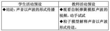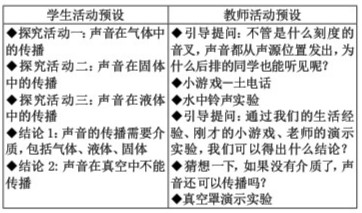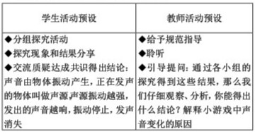 上海市文来中学 林青霞 一、教学分析 《声音与听觉》是牛津上海版《科学》教材第十一章《感知与协调》的重要教学模块之一,因此是《听觉》的第一课,是本模块的基础。从生活走进科学,教材首先用三幅不同声源的图把学生带入了声音的情境,接着又通过一系列声音小实验,引导学生观察和分析知道“声音是由物体振动产生的”以及“声音传播的条件”。教材中注重科学探究,提倡学习方式多样化,是一节科学探究型课。但因限于学生的年龄和知识能力层次,所以又不是完整的科学探究过程,而是突出科学探究要素中“提出问题”这一环节。这样的设计,是由七年级学生的心理特点和认知水平决定的,学生学习本节内容时,对探究活动还处于初级阶段。但这些探究活动在激发学生的求知欲,锻炼学生的参与能力,培养学生的观察能力、合作意识以及科学探究精神等方面都有不可替代的作用。 对学生而言,声音是最熟悉的现象之一,也是学生日常生活中经常接触到的科学现象。本次上课班级是七年级(5)班,他们不仅在生活中积累了大量与声音有关的感性知识,而且在小学自然课中也学过了与声音有关的常识,已有初步的动手探究、观察实验现象、分析总结概括能力。尽管有这些前期经验与常识,但是对其原理没有很深的探究,特别是声波这样看不见、摸不着的抽象概念比较难理解。 本节课通过教材中一系列的探究实验,即便他们有自主探究的能力,仍需加强学生规范化操作的训练和团队合作意识以及表达能力的培养,同时使学生能在已有认识的基础上,对声的世界有更进一步的了解和认识。 二、教学目标 1.通过“探究声音的产生”活动,知道声音是由物体振动产生的,增强表达交流的能力、团队协作能力、对事物勇于探索的意识; 2.通过“探究声音的传播条件”活动,知道声音的传播需要介质,真空中不能传播声音,学会简单的实验操作技能,切身感受探究过程; 3.通过“声音的传播形式与粒子模型”活动,知道声音以声波形式传送,感受解决问题的途径和科学研究的一般方法,有目的地观察。 三、教学重点与难点 【重点】知道声音是由物体振动产生的;声音的传播需要介质【难点】用粒子模型解释声波 四、教学设计思路 本节课采用实验教学,充分利用多媒体为学生提供丰富的感性知识。力图从学习方式的三个维度(自主性、探究性、合作性)组织教学,采用小组探索实验、大组间交流、师生间相互质疑等方式,让学生通过集体或个体自主活动获得知识、得到发展;为学生创造充分发表看法与意见的机会,通过交流研讨引发学生积极思维、更新认知结构,落实三维教学目标。 通过活动一“探究声音的产生”大家达成共识:声音是由物体振动产生的,振动越强,发出的声音越响;通过活动二“探究声音的传播条件”用实验证实声音在真空中不能传播,它需要介质:气体、液体、固体;再通过活动三“声波与粒子模型”,并借助于实验和多媒体创造“声音的传播”相应的“图景”,引导学生从粒子模型角度解释声波的传送,加深对声波的认识;最后通过学以致用,要求学生利用已学知识去解决实际问题,使学生体悟科学来自于生活又应用于生活。 本课的重点是声音是由物体振动产生的;声音的传播需要介质。教学过程中,以教材的探究实验为基础,设计了一系列的探究实验活动,帮助学生掌握知识点,有效突出重点。本课的难点在于声音在介质中以声波的形式传送,抽象又难以理解,所以根据教材的弹簧模拟声波实验从宏观上给学生提供形象的画面,再从微观粒子模型进行声波产生原因的解释,通过学生讨论、交流与质疑等方式,以此突破难点同时渗透科学学科素养。本课在教师有目的的指导下,以学生自主探究为主,开展教学活动,培养学生的科学探究能力,激发学生探索科学的兴趣和热情。 五、学习器材和资源准备 【教学资源】 一、实验器材: 教师用:音叉、小锤;水槽、手机、防水袋;大烧杯、真空玻璃罩、手动抽气机; 学生用:钢尺、弦音计、小鼓、黄豆、土电话、弹簧。 二、多媒体资源:PPT课件、学生自制视频:《弹簧模拟声波传播》 六、教学内容组织 【教学流程】 【活动设计】 【引入】小游戏 【活动目标】课题引入,感受声音的美妙,激发学生的兴趣。 【活动一】探究声音的产生 【活动目标】学生通过分组进行不同的探究实验,最后小组展示,全班交流寻找共同特征,达成共识:物体振动产生声音。掌握初步的实验操作技能,乐于表达交流并养成团队协作的意识。 【活动二】探究声音传播的条件 【活动目标】通过探究活动及交流,认识声音的传播介质,使学生参与到探究过程中,认识到对比法和推理法在科学实验中的应用,掌握初步的实验操作技能。 【活动三】声音传播的形式与粒子模型 【活动目标】通过观看学生自制视频及动手实验,认识声音是以声波形式传送的,感受解决问题的途径和科学研究的一般方法,初步学会有目的地观察。 七、板书设计 八、学习任务单 九、训练与评价 十、作业布置 1.(必做)练习册P56 《11.3 听觉》1、8、10、12、14、20、21 2.预习教材P166-177 (选做)动手活动:小组合作,制作一个能发出不同声音的弦音计
