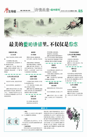沉醉东风·重九 (元)关汉卿 题红叶清流御沟,赏黄花人醉歌楼。 天长雁影稀,月落山容瘦。 冷清清暮秋时候,衰柳寒蝉一片愁,谁肯教白衣送酒。 点评:这是一首元曲。“题红叶清流御沟,赏黄花人醉歌楼”,好美。“天长雁影稀,月落山容瘦”,一个“瘦”用得极妙。 九月九日忆山东兄弟 (唐)王维 独在异乡为异客,每逢佳节倍思亲。 遥知兄弟登高处,遍插茱萸少一人。 点评:明明是写我想兄弟,却偏偏写成遥想兄弟登高、插茱萸却少了我……“每逢佳节倍思亲”这个名句,更使这首诗超越重阳,成为节日思亲的经典语录。 醉花阴 (宋)李清照 薄雾浓云愁永昼,瑞脑销金兽。 佳节又重阳,玉枕纱橱,半夜凉初透。 东篱把酒黄昏后,有暗香盈袖。 莫道不销魂,帘卷西风,人比黄花瘦。 点评:重阳岁晚,西风黄花,一首词写尽重阳的忧伤。“莫道不销魂,帘卷西风,人比黄花瘦”,也成千古名句。意境很美,知名度很高。 采桑子•重阳 (近现代)毛泽东 人生易老天难老,岁岁重阳。今又重阳,战地黄花分外香。 一年一度秋风劲,不似春光。胜似春光,寥廓江天万里霜。 点评:领袖气派,纵横捭阖,超越普通人的时空观。把几缕愁绪暗寄予战地黄花,惆怅中也见豪情。 过故人庄 (唐)孟浩然 故人具鸡黍,邀我至田家。 绿树村边合,青山郭外斜。 开轩面场圃,把酒话桑麻。 待到重阳日,还来就菊花。 点评:把农家院的恬静和舒服的生活,诗人和老友的情谊,都描写得淋漓尽致,虽然是在春天遥想重阳节,那种相聚恨晚、意犹未尽的感觉,自然流露。 阮郎归 (宋)晏几道 天边金掌露成霜。云随雁字长。绿杯红袖趁重阳。人情似故乡。 兰佩紫,菊簪黄。殷勤理旧狂。欲将沉醉换悲凉。清歌莫断肠。 点评:一首词同时写出了重阳的凄冷和温暖,很耐咀嚼。 重阳席上赋白菊 (唐)白居易 满园花菊郁金黄,中有孤丛色似霜。 还似今朝歌酒席,白头翁入少年场。 点评:以花拟人,悲从心生。酒席终散,人也将老,受不了的苍凉和沉痛。 于长安归还扬州九月九日行薇山亭赋韵 (南朝)江总 心逐南云逝,形随北雁来。 故乡篱下菊,今日几花开? 点评:身心分离,遥念故乡。不说思人,偏问花朵,韵味深长。 蜀中九日 (唐)王勃 九月九日望乡台,他席他乡送客杯。 人情已厌南中苦,鸿雁那从北地来。 点评:重阳佳节,流落异乡,虽有酒杯,却不是乡情。偏偏鸿雁还从家乡飞来,更加平添了一份乡愁。 九月十日即事 (唐)李白 昨日登高罢,今朝更举觞。 菊花何太苦,遭此两重阳? 点评:昨天登高,今天饮酒,都是伤心。菊花之苦,其实源于自己的心苦。