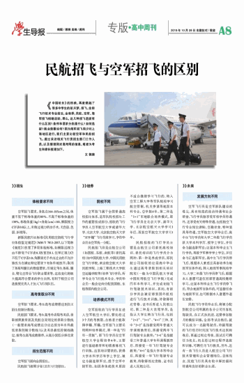 《中国机长》的热映,再度燃起了很多中学生的航天梦。招飞,全称飞行技术专业招生,金秋季,民航、空军、海军招飞相继启动。那么,这几种招飞选拔有什么区别?条件和要求分别是什么?如何选拔?就业前景如何?因为海军招飞很少对上海地区进行,我们主要比较空军和民航招飞。通过采访相关飞行员招生部门工作人员,以及整理阳光高考网的信息,笔者为考生和家长梳理如下。 文 郭漪 》》招生 体检要求不同 空军招飞要求,身高在164-185cm之间,体重不低于标准体重的80%、不高于标准体重的130%,标准体重(kg)=身高(cm)-110。裸眼视力C字表0.8以上,未做过视力矫治手术,无色盲、色弱、斜视等。 新版民航行业标准《民用航空招收飞行学生体检鉴定规范》(MH/T 7013-2017,以下简称《规范》)放宽了多项体检标准,如裸眼远视力由不得低于C字表0.3放宽至0.1,但矫正视力仍不低于C字表1.0;角膜屈光手术由过去的不允许修改为在满足特定要求下有条件地放开;取消了身高和腿长的数值要求,仅规定考生身高、腿长、臂长应符合飞行职业要求等。这些变化将极大提高符合要求的学生比例,有利于航空公司选拔更优秀人才加入飞行员队伍。 高考录取分不同 空军招飞要求,考生高考成绩需达到自主招生控制分数线。 民航招飞要求,考生高考外语限考英语,录取按照教育部及民航总局划定的录取分数线(一般要求高考成绩总分应达到当年本科最低录取控制分数线)以及英语最低控制线确定,按考生高考成绩排序,从高分到低分择优录取。 招生范围不同 空军招飞面向全国招生。民航招飞按照分省(区市)计划招生。 》》培养 院校不同 空军招飞属于全国普通高校招生体系,是军队院校招生工作的重要组成部分,招收的飞行学员入空军航空大学或清华大学、北京大学、北京航空航天大学“双学籍”飞行员班学习,学员毕业后由空军统一分配。 民航招飞则是由航空公司(如国航、东航、南航等)委托高校(如中国民航大学、中国民用航空飞行学院、南京航空航天大学民航学院、上海工程技术大学航空运输学院等)培养飞行学员,所学专业为飞行技术专业。学员毕业后一般会定向分配到国航、东航等国内航空公司。 培养模式不同 空军招收的飞行学员在进入空军航空大学后,要先经过3个月的考察期,合格者才能取得学籍、军籍。空军招飞主要采用两种培养模式,第一种是“四年一贯制”,即飞行学员在空军航空大学全程培养4年,主要进行基础教育和初级教练机飞行训练。达到培训要求的,获得大学本科学历和学士学位,被定为副连职军官,授予空军中尉军衔。如因身体或技术原因不适合继续学习飞行的,转入空军工程大学等军队院校学习航空管制、机关参谋等地面本科专业,总学制4年。第二种是“3+1”军地联合培养模式,即飞行学员在北京大学、清华大学、北京航空航天大学学习3年后,再到空军航空大学学习1年。 民航招收的飞行学员主要是由航空公司委托高校培训,委托培训的飞行学员分为两种:第一种是养成学员,即民航公司招收的应届高中毕业生通过高考录取到相关培训院校(一般为中国民航大学或中国民用航空飞行学院)完成四年本科学习,并完成初始飞行驾驶技术培训。其间,有部分学员会被安排到国外航校进行飞行技术训练,待取得相应资格、证书后再进入民航公司。第二种是大改驾学员,是指从大学生转为飞行员,包括“2+2”、“3+1”、“4+1”三种,其中“2+2”是指接受两年普通大学课程教育后,再接受两年飞行驾驶专业教育;“3+1”是指接受三年普通大学专科课程教育后,再接受一年飞行驾驶专业教育;“4+1”是指大学本科毕业后,再接受一年飞行驾驶专业教育,待取得相应资格、证书后进入民航公司。 》》未来 发展方向不同 空军飞行员是空军部队建设的塔尖,具有较高的政治待遇和社会荣誉。飞行学员除享受军校学员待遇外,还享受有关特殊待遇,包括航空飞行专业岗位津贴、空勤伙食、特种装具等待遇。空军航空大学毕业后,高中生飞行学员和大学二年级飞行学员获大学本科学历、授学士学位,并任命为副连职军官;应届本科毕业生飞行学员,再授予军事学学士学位,并任命为正连职军官。高中生飞行学员停飞后,根据本人素质且具备培养为地面军官条件的,转入地面军事院校学习。大学二年级飞行学员停飞后,根据本人意愿可退伍回原普通高校继续学习。应届本科毕业生飞行学员停飞后,符合地面军官条件的,可直接任命为地面军官,也可根据本人意愿作退伍安排。 民航飞行学员毕业后,将被分配到航空公司所属的各分公司当客机驾驶员。在正式执机前,还要参加数月的模拟训练,全部考试合格后,就可以成为一名副驾驶员。待副驾驶的飞行经历时间及飞行技术达到标准后,再通过相应考核、面试后可聘任为机长。机长经过相应程序选拔和训练,可聘任为飞行教员。另外,还有一些飞行人员进入航空公司飞行技术管理和企业管理岗位。总体而言,民航飞行员具有较丰厚的福利待遇和良好的职业生涯。