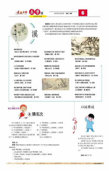 编者按:飞花令,原本是古人行酒令时的一个文字游戏,源自古人的诗词之趣,得名于唐代诗人韩翃《寒食》中的名句“春城无处不飞花”。行飞花令时可选用诗词曲中的句子,但选择的句子一般不超过七个字。《中国诗词大会》等诗词综艺栏目也引进并改良了“飞花令”,选手在规定时间内说出含有规定关键字的诗句即可。本栏目每周会推出飞花令,帮助同学们积累古诗词佳句。 路转溪桥忽见 《西江月·夜行黄沙道中》 宋·辛弃疾 闻说双溪春尚好,也拟泛轻舟,只恐双溪舴艋舟 《武陵春·春晚》 宋·李清照 山下兰芽短浸溪 《浣溪沙·游蕲水清泉寺》 宋·苏轼 荆溪白石出,天寒红叶稀 《山中》 唐·王维 大儿锄豆溪东,中儿正织鸡笼 《清平乐·村居》 宋·辛弃疾 常记溪亭日暮,沉醉不知归路 《如梦令·常记溪亭日暮》 宋·李清照 杨花落尽子规啼,闻道龙标过五溪 《闻王昌龄左迁龙标遥有此寄》 唐·李白 夜发清溪向三峡,思君不见下渝州 《峨眉山月歌》 唐·李白 梅子黄时日日晴,小溪泛尽却山行 《三衢道中》 宋·曾几 霜落熊升树,林空鹿饮溪 《鲁山山行》 宋·梅尧臣 雨里鸡鸣一两家,竹溪村路板桥斜 《雨过山村》 唐·王建 清溪非陇水,翻作断肠流 《秋浦歌十七首》 唐·李白 桃花尽日随流水,洞在清溪何处边 《桃花溪》 唐·张旭 多谢浣溪人不折,雨中留得盖鸳鸯 《莲叶》 唐·郑谷 却笑泸溪如斗大,肯把牛刀试手不 《破阵子·掷地刘郎玉斗》 宋·辛弃疾 溪上有鸳鸯,艇子频惊起 《卜算子·苕霅水能清》 宋·吴潜 兰溪三日桃花雨,半夜鲤鱼来上滩 《兰溪棹歌》 唐·戴叔伦 晴明风日雨干时,草满花堤水满溪 《桑茶坑道中》 宋·杨万里