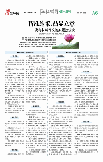 正所谓“题好一半文”,对材料作文来说,拟题非常重要。令人遗憾的是,在拟题方面,存在诸多问题,主要表现在:第一,摘取材料中的词语做题目,有失确当。第二,题目陈旧,缺乏新意。第三,题目宽泛,针对性不强。第四,题目过长,不够精炼。第五,故弄玄虚,华而不实。所以,应该在拟题上下一番真功夫。 ■什么样的文题是理想的? 针对性强 即文题一定是紧扣所给材料与文章内容的,一目了然的。也就是说,文题应紧扣材料,鲜明准确,有的放矢。 {例题} 阅读下面的材料,根据要求写作。 ①巧诈不若拙诚。(《韩非子·说林》)②桃李不言,下自成蹊。(《史记·李将军列传》)③临渊羡鱼不如退而结网。(《汉书·董仲舒传》)④安得广厦千万间,大庇天下寒士俱欢颜。(杜甫《茅屋为秋风所破歌》)⑤苟利国家生死以,岂因祸福避趋之。(林则徐《赴戍登程口占示家人》)⑥千教万教教人求真,千学万学学做真人。(陶行知) 读了以上六句名句,你有怎样的感触与思考?请以其中两三句为基础确定立意,并合理引用,写一篇文章。要求:自选角度,明确文体,自拟标题;不要套作,不得抄袭;不少于800字。 所拟题目为《诚信走遍天下,失信寸步难行》;《人之所助在信,信之所本在诚》,这样的题目,就非常契合所给材料,贴切、得当。 角度适切 就是说,切入的角度要小,在此基础上,深入开掘,不可太过宽泛。 {例题} 对悲伤的同情是生活中一种普遍而强烈的感情,然而旁观者眼里的悲伤未必是被同情者心中的悲伤。 对此你怎么看?请写一篇文章,谈谈你的思考。题目自拟,不少于800字。 据此拟题为《跨过那条鸿沟》;《多共情,少同情》,可谓视角新颖而贴切。 简明洗练 标题应短小精悍,一般在十个字左右,醒目上口,过目留痕,印象深刻。 {例题} 某班班会上,同学们纷纷介绍自己最欣赏的格言名句并畅谈感想,其中有六句同学们感受尤深,这六句是: ①凡百事之成也,必在敬之;其败也,必在慢之。(《荀子》)②千里之堤,溃于蚁穴。(《韩非子》)③立身成败,在于所染。(魏征)④青春须早为,岂能长少年。(孟郊)⑤问渠那得清如许,为有源头活水来。(朱熹)⑥灭人之国,必先去其史。(龚自珍) 请结合其中的两三句确定立意,并合理引用,联系现实和自身实际写一篇发言稿,在下次班会上与同学们交流。要求自选角度,明确文体,自拟标题;不要套作,不得抄袭;不少于800 字。 有同学拟题为:《趁青春,不负行》;《态度奠基础,细节筑高楼》;《青春须早为,但惜少年时》,意明简洁,一语中的。 新颖别致 即要尽可能地不落俗套,给人以耳目一新之感,由文题就能够激起读者的阅读兴味。 {例题} 有人说:这是一个不再羞于谈论梦想的时代,它支撑起无数大国工匠向星辰大海出发,也让这片土地上无数平凡人的梦想落地开花。迈入新时代的我们,拥有更多实现梦想的可能,拥有一往无前的奋斗姿态,拥有对美好明天的渴盼和信心。用力活着,才有分量;向前奔跑,才能抵达。为了更美好的中国,为了更美好的自己,新时代,我们一起出发! 请以“新时代再出发”或“新时代,我们一起出发”为副标题,写一篇文章。要求选好角度,确定立意;明确文体,自拟标题;不要套作,不得抄袭;不少于800字。 以下拟题,受到阅卷老师的青睐:《一切尽在期待中》、《勇做新时代的弄潮儿》。 ■如何拟制理想的文题? 化用名句 包括古诗文和名人名言、歌词等。这样的拟题,能够彰显文化含量、文化品位和语言魅力,增强厚重感。 如“山登绝顶我为峰”、“仰望星空与脚踏实地”、“天光云影共徘徊”,化用名句入题,不仅增添了文章的文采和文化气息,还能体现考生较好的文学素养和较高的语言运用能力。 {例题} 对于中国人而言,很多人认为,传统奋斗的五大关键词为:背景、学历、资源、机遇、经验;而当下奋斗的五大关键词为:知识、创新、实干、个性、理想。作为新时代的年轻人,你如何看待上述变化?请从传统与当下奋斗的关键词中选择两三个,谈谈你的理解与看法。要求选好关键词,使之形成有机的关联;选好角度,明确文体,自拟标题;不要套作,不得抄袭;不少于800字。 有个考生这样拟题《腹有诗书,脚踏实地》,就给人以视觉冲击力。 巧用修辞 文章的标题非常讲究语言的锤炼、生动和形象,尽可能做到醒目新颖,引人入胜,让人过目不忘。而恰当地运用设问、对比、比喻、反问、拟人等修辞手法来拟题,就能够达成目标。 比如“信心——低谷暗影里的阳光”、“风雨过后有阳光”、“创新让他们走出沼泽地”,这些题目灵动地运用拟人、比喻等修辞,准确地揭示出所给材料的内涵。 {例题} 点击链接就可以阅读美文,打开图片就可以欣赏风景,扫码支付就可以购买时装……科学的发展使成果的共享变得更加便捷。只是,我们仍然很难共享写作者的思考、摄影师的体验、设计师的匠心……这些仍然属于独创者独有。对于国家而言,你可以共享别国科学发展的成果,只是很难共享他们独有的关键核心技术。因为关键核心技术要不来,买不来,讨不来。我们生活中并不缺乏“共享者”,同时,新时代的中国呼唤着更多的年轻人成为某一领域的独创者、独有者。因为,有什么样的青年,中国就会有什么样的未来。 以上材料触发了你怎样的感悟或思考?请根据材料写一篇文章,表明你的态度,阐述你的看法。要求:选好角度,确定立意,明确文体,自拟标题;不要套作,