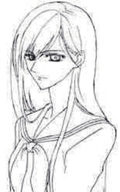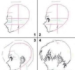 步骤一: 1.确定头型。斜侧面的头型是兼有正面和正侧面特点的形状,一面更类似正面,另一面更类似正侧面,大家请结合正面和正侧面的图,想象这个形状的空间立体结构。 2.在鼻中线、水平中线方向画上十字线。注意两条线都是带有弧度的,一定要画得带有立体感。 3.眉眼框。同样是左右并不对称,下线也要带有弧度,靠近的一侧一定要长一些,具体长度要看头部的角度而定。 4.视线与耳鼻线、脸颊线、耳中线。视线与耳鼻线与水平中线画法类似;脸颊线与正侧面类似,是由眉眼框的竖线延长形成,这条线与鼻中线另一侧的脸轮廓线形成的平面就是正面的脸;耳中线的位置则由脸颊线的位置与后脑线推断出。 步骤二: 1.脸轮廓线。一侧从眉线画起(同时带有正面颧骨的突起与正侧面嘴部的收缩特点),另一侧只需要画到耳鼻线即可(更类似于正侧面的下颌骨轮廓,但要注意弧度的变化)。 2.眼睛、眉毛。其中一侧眼睛的内眼角紧靠鼻中线,另一侧的眼睛则仍要注意“五眼”的关系,保持双眼的距离;一侧的眉毛直接画到眉心点,另一侧的眉毛则要断开,但延长线同样汇聚到眉心点。 3.鼻子、嘴、耳朵。鼻子的起、终点都位于鼻中线上,呈折线型,通常起终点是视线与鼻中线的交点,鼻尖在耳鼻线的平面上,注意折线的距离要与脸的角度保持协调,不要折出去太远;嘴也并不对称,鼻中线两侧的长度与鼻中线两侧的脸部长度相对应;耳朵兼有正面和正侧面的特点。 4.发迹线和头发外轮廓。请注意一侧的头发在脸颊线的位置出现的拐点,这样才能突出脸的立体感。 步骤三: 1.对头发的轮廓线进行修正。 2.对头发的细节进行补充。注意如果是如图这样的分头,头发要汇聚形成发线,发型才会自然。 3.成品图。