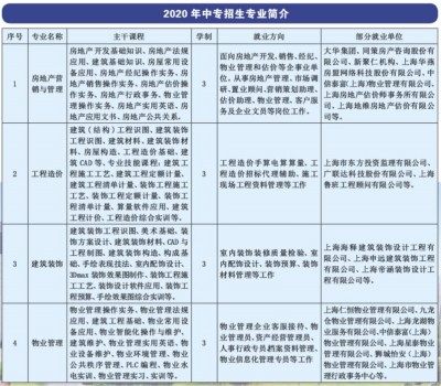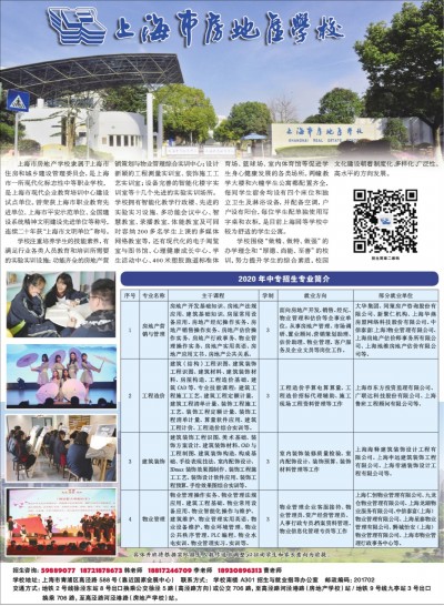 上海市房地产学校隶属于上海市住房和城乡建设管理委员会,是上海市一所现代化标志性中等职业学校,是上海市现代企业教育培训中心建设试点单位。曾荣获上海市职业教育先进单位、上海市平安示范单位、全国建设系统精神文明建设先进单位等称号,连续二十年获“上海市文明单位”称号。 学校注重培养学生的技能素养,有满足行业各类人员教育和培训所需要的实验实训设施:功能齐全的房地产营销策划与物业管理综合实训中心;设计新颖的工程测量实训室、装饰施工工艺实训室;设备完善的智能化楼宇实训室等十几个先进的实验实训场所。学校拥有智能化教学行政楼、先进的实验实习设施、多功能会议中心、智慧教室、录播教室、体能教室及可同时容纳200多名学生上课的多媒体网络教室等,还有现代化的电子阅览室与图书馆、心理健康成长中心、学生活动中心、400米塑胶跑道标准体育场、篮球场、室内体育馆等促进学生身心健康发展的各类场所。两幢教学大楼和六幢学生公寓都配置齐全,每间学生宿舍均设有四个床位和独立卫生及淋浴设备,并配备空调,户户设有阳台,每位学生配单独使用写字桌和衣柜,是目前上海同等学校中较为舒适的学生公寓。 学校围绕“做精、做特、做强”的办学理念和“厚德、尚能、至善”的校训,努力提升学生的综合素质,校园文化建设朝着制度化、多样化、广泛性、高水平的方向发展。 招生咨询:59889077 18721878673韩老师 18817246709李老师 18930896313曹老师 学校地址:上海市青浦区高泾路588号(靠近国家会展中心) 联系方式:学校南楼 A301 招生与就业指导办公室 邮政编码:201702 交通方式:地铁2号线徐泾东站8号出口换乘公交徐泾5路(高泾路方向)或公交706路,至高泾路河泾港路(房地产学校)站/地铁9号线九亭站3号出口 换乘706路,至高泾路河泾港路(房地产学校)站。