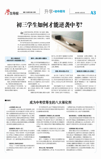 初三真的不缺乏奇迹,有许多初一初二成绩一般般,可是到了初三通过自己努力成功逆袭的例子,反而有些成绩好的因为疏忽,对自己放松,不断地吃老本,导致自己的成绩停留在原地或者退步,在初三只要自己努力,一切皆有可能,努力是奇迹的代名词。 对于初中来说总体还是比较简单,知识体系也比较简单,所以我们更重要的是要调整心态,不要害怕,相信自己可以的。在初三上半学期我们首要的目的是打好基础,为初三下学期的冲刺做好充足的准备。下面先给大家对于每个学科进行分析,让大家在宏观上对于学科有一个新的认知。 语文:基础知识+综合性学习+阅读理解+作文 基础知识尽量不要丢分。无论你的字多么脏乱差,都要尽力地写工整。不求美观,只求工整,休息的时候可以去写写字帖,效果很明显的。 现在网上阅卷字的好坏真的很重要,阅卷老师第一眼看你的字就定作文的档次,古诗文言文书下注释一定要背得烂熟于心,特别是一些常见的注释。 阅读,各种修辞描写的作用都积累一些,只要找到关键词就是对的。 语文主要是在于平时的积累,一定要多看多背,多积累一些作文素材。语文真的有必要搞个摘抄本。 数学:上课认真听+错题本 课堂上你不听回家再做题也没用。有的同学在课上写作业,如果你都学会了那么无所谓,如果你没学会就是大错。 上课认真听讲,下课可以拿一个笔记本记一下重要的题型、易错点……每个星期都要定时复习。 数学公式也是非常重要的,有的计算题往往写出公式就会得分。 解方程的应用题你设出未知也是得分的,反正尽量多写点,实在不会有时间的话也随便写一点。 压轴题主要还是要注重思想,要多练习,多总结,多思考,不要一不会就想着去看答案。 错题本是非常关键的,题目永远都做不完,我们要学习解题的方法和技巧,考试前多看错题可以事半功倍,让你牢记易错点。 搞懂之后,要大量做题,其实现在的教辅资料都不错,关键是认认真真地去做,要做精。 英语:单词+语法+作文 每天背十个就可以了,背多了容易忘而且容易放弃,对自己的信心有所打击。其实我觉得你就背后面的词汇表也可以。时间充足可以看下那种双语的书。 语法很重要。可以买一本语法书自己看,英语可以有很明显的进步。初三总复习时会专门复习各类词性。每天一定要背一点单词,这样才不容易忘记。 阅读理解一定要先看题目,一般题目的顺序和文章顺序是一样的。作文,又是练字的时刻了,美观还是第一点。多背几篇范文,就基本八九不离十。必备句型和连接词什么的掌握一些,是进步的关键。 物理化学:理解公式+记笔记 理解公式概念之后可以背出来。把基础题做对,压轴题最后一问实在不会就丢了。对于成绩好的来说,要多钻难题,善于整理笔记——把一些重要实验记在笔记本上。 化学就比较容易了,因为初三才学,所以只要跟上老师的节奏,就应该不会差到哪里了。非常有必要提前预习,把书吃透。