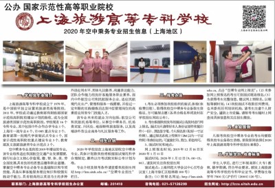 一、学校及专业简介 上海旅游高等专科学校成立于1979年,是中国较早独立设置的旅游类高等院校。2011年,学校成功通过教育部和财政部国家示范性高职院校建设计划的验收,成为全国旅游类国家示范性高职院校。学校现有16个专科专业,其中包括中外合作办学专业1个,上海市一流专业6个,市085重点专业2个,教育部第一批现代学徒制试点专业1个,国家示范性高职院校重点建设专业3个,教育部及文旅部旅游类专业示范点2个。 空中乘务专业是我校2019年增设的专业,该专业培养适应我国航空交通产业发展需要,践行社会主义核心价值观,德、智、体、美、劳全面发展,具有良好的思想品德和职业道德,掌握空中乘务专业必备专业基础知识和专项技能,具备从事客舱服务理论知识和较强实践动手能力,具有较高的以英语为主的多种外语应用水平、形体礼仪修养、沟通表达能力、团队合作能力的良好客舱服务职业素养,面向中外航空公司和民航服务企业,适应民航现代化生产、管理和服务一线需要,并经过一定年限的实践锻炼后达到中层管理岗位的高素质应用型专门技能人才。 该专业未来的就业方向包括:航空公司和民航机场等单位,从事空中乘务员、机场贵宾室、问讯处、地面特殊旅客服务,以及高端涉外型企业商务与礼仪服务等工作。 二、招生计划 2020年学校拟在上海地区招收空中乘务专业,具体计划数我校将根据面试情况科学合理制定,最终以市考试院实际公布计划为准。 专业介绍及报考条件请查看我校招生网站http://lzzs.sitsh.edu.cn/“空乘专业招生”栏目。 三、报考办法 1、考生必须参加我校组织的面试、体检(体检费自理),取得我校空中乘务专业备取生资格后,方可填报志愿(各类合格名单将及时在学校招生网站公布)。 2、考生根据我校发布的面试公告及时进行网上报名,面试当天请带好本人身份证原件和复印件(一份)、黑色签字笔、个人报名表(贴好一寸证件照),通过报名系统上传照片(2M以内一寸证件照)和身份证的,可直接打印,黑白、彩色均可。 3、面试时间和地点: 网上预报名时间:2019年12月16日至2020年1月11日 面试时间:2020年1月12日(9:00-15:00),请及时关注我校招生网 面试地点:上海师范大学会议中心五号会议室(上海市徐汇区桂林路100号) 备注:(1)预报名网址:http://lzzs.sitsh.edu.cn,点击“空乘专业网上报名”;(2)未参加网上预报名的考生可到面试现场报名;(3)为获得考生完整信息,建议网上预报名,以缩短等候时间;(4)我校面试不收取任何费用,也未委托任何培训机构,请考生注意个人财产安全,谨防上当受骗。请报考考生随时上网查询具体信息和关注招生微信。 四、录取原则 凡报考我校空中乘务专业的考生均要取得我校专业备取生资格,录取原则依照《2020年上海旅游高等专科学校招生章程》。 五、学制学历、收费标准 学生入学后,进行三年制高职(大专)教育,修学期满,符合毕业要求,颁发上海旅游高等专科学校的专科毕业证书。学费每生每学年7500元(沪价行(2000)120号)。 联系部门:上海旅游高等专科学校招生办公室 邮编:201418 咨询电话:021-57126299 招生网址:http://lzzs.sitsh.edu.cn