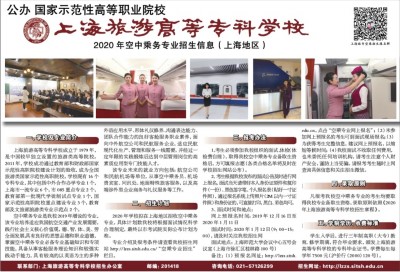 一、学校及专业简介 上海旅游高等专科学校成立于1979年,是中国较早独立设置的旅游类高等院校。2011年,学校成功通过教育部和财政部国家示范性高职院校建设计划的验收,成为全国旅游类国家示范性高职院校。学校现有16个专科专业,其中包括中外合作办学专业1个,上海市一流专业6个,市085重点专业2个,教育部第一批现代学徒制试点专业1个,国家示范性高职院校重点建设专业3个,教育部及文旅部旅游类专业示范点2个。 空中乘务专业是我校2019年增设的专业,该专业培养适应我国航空交通产业发展需要,践行社会主义核心价值观,德、智、体、美、劳全面发展,具有良好的思想品德和职业道德,掌握空中乘务专业必备专业基础知识和专项技能,具备从事客舱服务理论知识和较强实践动手能力,具有较高的以英语为主的多种外语应用水平、形体礼仪修养、沟通表达能力、团队合作能力的良好客舱服务职业素养,面向中外航空公司和民航服务企业,适应民航现代化生产、管理和服务一线需要,并经过一定年限的实践锻炼后达到中层管理岗位的高素质应用型专门技能人才。 该专业未来的就业方向包括:航空公司和民航机场等单位,从事空中乘务员、机场贵宾室、问讯处、地面特殊旅客服务,以及高端涉外型企业商务与礼仪服务等工作。 二、招生计划 2020年学校拟在上海地区招收空中乘务专业,具体计划数我校将根据面试情况科学合理制定,最终以市考试院实际公布计划为准。 专业介绍及报考条件请查看我校招生网站http://lzzs.sitsh.edu.cn/“空乘专业招生”栏目。 三、报考办法 1、考生必须参加我校组织的面试、体检(体检费自理),取得我校空中乘务专业备取生资格后,方可填报志愿(各类合格名单将及时在学校招生网站公布)。 2、考生根据我校发布的面试公告及时进行网上报名,面试当天请带好本人身份证原件和复印件(一份)、黑色签字笔、个人报名表(贴好一寸证件照),通过报名系统上传照片(2M以内一寸证件照)和身份证的,可直接打印,黑白、彩色均可。 3、面试时间和地点: 网上预报名时间:2019年12月16日至2020年1月11日 面试时间:2020年1月12日(9:00-15:00),请及时关注我校招生网 面试地点:上海师范大学会议中心五号会议室(上海市徐汇区桂林路100号) 备注:(1)预报名网址:http://lzzs.sitsh.edu.cn,点击“空乘专业网上报名”;(2)未参加网上预报名的考生可到面试现场报名;(3)为获得考生完整信息,建议网上预报名,以缩短等候时间;(4)我校面试不收取任何费用,也未委托任何培训机构,请考生注意个人财产安全,谨防上当受骗。请报考考生随时上网查询具体信息和关注招生微信。 四、录取原则 凡报考我校空中乘务专业的考生均要取得我校专业备取生资格,录取原则依照《2020年上海旅游高等专科学校招生章程》。 五、学制学历、收费标准 学生入学后,进行三年制高职(大专)教育,修学期满,符合毕业要求,颁发上海旅游高等专科学校的专科毕业证书。学费每生每学年7500元(沪价行(2000)120号)。 联系部门:上海旅游高等专科学校招生办公室 邮编:201418 咨询电话:021-57126299 招生网址:http://lzzs.sitsh.edu.cn