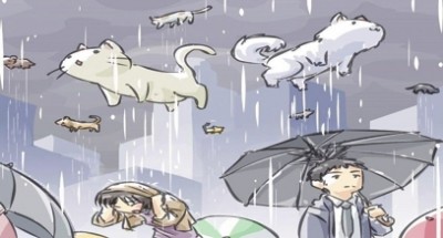 英国作家乔纳森·斯威夫特[Jonathan Swift,《格列佛游记》的作者],曾在他1710年的讽刺诗《A Description of a City Shower》中描绘过这种场景。我们能找到的这句成语的最早版本是在1653年,Richard Brome的喜剧《The City Wit or The Woman Wears the Breeches》中对于暴雨的描写:“It shall raine... Dogs and Polecats”,而以“cats and dogs”形