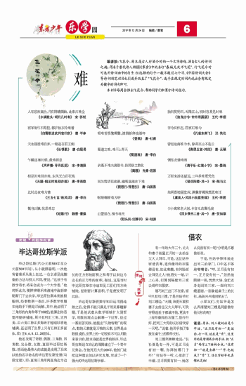 毕达哥拉斯(约公元前580年至公元前500年间),从小就很聪明,一次他背着柴禾从街上走过,一位长者见他捆柴的方法与别人不同,便说:“这孩子有数学奇才,将来会成为一个大学者。”他闻听此言,便摔掉柴禾南渡地中海到泰勒斯门下去求学。毕达哥拉斯本来就极聪明,经泰勒斯一指点,许多数学难题在他的手下便迎刃而解。其中,他证明了三角形的内角和等于180度;能算出你若要用瓷砖铺地,则只有用正三角、正四角、正六角三种正多角砖才能刚好将地铺满,还证明了世界上只有五种正多面体,即:正4、6、8、12、20面体。 他还发现了奇数、偶数、三角数、四角数、完全数、友数,直到毕达哥拉斯数。然而他最伟大的成就是发现了后来以他的名字命名的毕达哥拉斯定理(勾股定理),即:直角三角形两直角边为边长的正方形的面积之和等于以斜边为边长的正方形的面积。据说,这是当时毕达哥拉斯在寺庙里见工匠们用方砖铺地,经常要计算面积,于是便发明了此法。 毕达哥拉斯将数学知识运用得纯熟之后,觉得不能只满足于用来算题解题,于是他试着从数学领域扩大到哲学,用数的观点去解释一下世界。经过一番刻苦实践,他提出“凡物皆数”的观点,数的元素就是万物的元素,世界是由数组成的,世界上的一切没有不可以用数来表示的,数本身就是世界的秩序。毕达哥拉斯还在自己的周围建立了一个青年兄弟会。在他死后大约200年,他的门徒把这种理论加以研究发展,形成了一个强大的毕达哥拉斯学派。