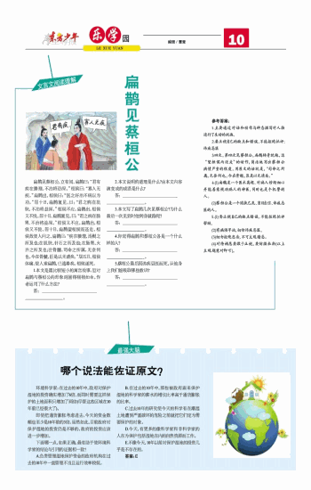 扁鹊见蔡桓公,立有间,扁鹊曰:“君有疾在腠理,不治将恐深。”桓侯曰:“寡人无疾。”扁鹊出,桓侯曰:“医之好治不病以为功。”居十日,扁鹊复见,曰:“君之病在肌肤,不治将益深。”桓侯不应。扁鹊出,桓侯又不悦。居十日,扁鹊复见,曰:“君之病在肠胃,不治将益深。”桓侯又不应。扁鹊出,桓侯又不悦。居十日,扁鹊望桓侯而还走。桓侯故使人问之,扁鹊曰:“疾在腠理,汤熨之所及也;在肌肤,针石之所及也;在肠胃,火齐之所及也;在骨髓,司命之所属,无奈何也。今在骨髓,臣是以无请矣。”居五日,桓侯体痛,使人索扁鹊,已逃秦矣。桓侯遂死。 1.本文是篇比较短小的寓言故事,但对扁鹊与蔡桓公的形象刻画得栩栩如生。作者运用了什么方法? 答:________________________________________________________。 2.本文说明的道理是什么?由本文内容演变成的成语是什么? 答:________________________________________________________。 3.本文写了扁鹊几次见蔡桓公?为什么最后一次见到时他转身就跑呢? 答:________________________________________________________。 4.你觉得扁鹊和蔡桓公各是一个什么样的人? 答:________________________________________________________。 5.蔡桓公最后因讳疾忌医而死,从他身上我们能吸取哪些教训? 答:________________________________________________________。 参考答案: 1.主要通过对话和动作与神态描写对人物进行了生动的刻画。 2.要正视自己的缺点和错误,不能拒绝批评;讳疾忌医 3.四次。第四次见蔡桓公,扁鹊转身就跑,这“望桓侯而还走”的动作,简洁地写出蔡桓公病情严重的程度。用原文的话就是,“司命之所属,无奈何也。今在骨髓,臣是以无请矣。” 4.(1)扁鹊是一个医术高超、对病人诊断细心并能善意规劝病人的神医,同时也是个机警的人。 (2)蔡桓公是一个固执己见、盲目自信、讳疾忌医的人。 5.(1)要正视自己的缺点错误,不能拒绝批评帮助。 (2)有病须早治,切勿讳疾忌医。 (3)切勿拒绝忠告,不可主观猜忌。 (4)对待祸患要敢于正视,要防微杜渐(以上主观题意对即可)。
