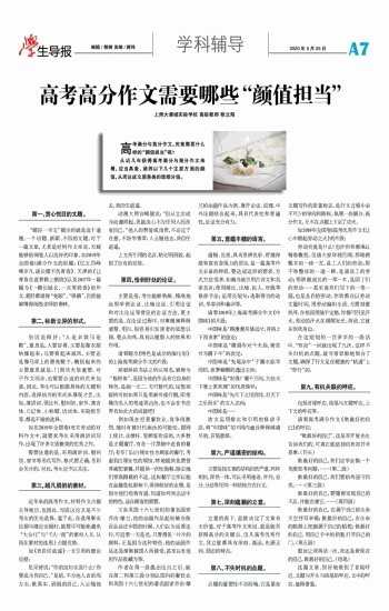 上师大康城实验学校 高级教师 程立海 高考满分与高分作文,究竟需要什么样的“颜值担当”呢? 从近几年获得高考满分与高分作文来看,应当具备、涵养以下几个主要方面的颜值,从而达成文质兼美的理想分值。 第一,赏心悦目的文题。 “题好一半文”揭示的就是这个道理,一个切题、新颖、不俗的文题,对于一篇文章,尤其是材料作文来说,无疑能够给阅卷人以良好的印象。如2019年全国卷1满分作文的拟题:《忆五四峥嵘岁月,请长缨不负青春》、天津的《让青春在逐梦路上燃烧》以及2017年一篇题为《一横长城长,一点茉莉香》的作文,题目都堪称“亮眼”、“吸睛”,自然能够博得阅卷老师的青睐。 第二,标新立异的形式。 俗话说得好:“人是衣裳马是鞍”,意思是,人要好看,主要是靠衣服给撑起来;马要看起来威风,主要还是靠马背上的漂亮鞍子。概括起来的主要意思就是:门面功夫很重要。对于作文而言,也需要合适的形式来包装。因此,考生可以根据具体的文题和内容,选择恰当的形式来展现才艺。比如,演讲词、倡议书、慰问信、家书、寓言体、日记体、小标题、访谈体、实验报告等,都是不错的选择。 如在2019年全国卷1有关劳动的材料作文中,就要求考生采用演讲词写作,出现了许多文质兼美的优秀之作。 需要注意的是,采用演讲词、慰问信、家书等形式写作,格式要正确,否则会失分的。对此,考生应予以关注。 第三,超凡脱俗的素材。 近年来的高考作文,材料作文占据主导地位,也因此,写成议论文是不少考生的优先选择。鉴于此,在选用事实论据与理论论据时,就要尽可能地避免“大众化”与“千人一面”的素材入文,从而在素材的选用上占据优势。 如《我自任逍遥》一文引用的理论论据: 尼采曾说:“你的良知在说什么?你要成为你自己。”是的,不为他人言语而左右,做真实、洒脱的自己,人云随他去,我自任逍遥。 动漫大师宫崎骏说:“自从立志成为动漫师起,我就决心不为任何人而改变自己。”他人的赞誉或指责,不必过于在意。不妨学莠草:人云随他去,我自任逍遥。 上文所引用的名言,贴切而别致,起到了应有的功效。 第四,恰到好处的论证。 主要是指,考生能够熟练、精准地运用举例论证、比喻论证、引用论证和对比论证等常见的论证方法,更主要的是,在论证过程中,对事理阐释得清楚、明白,很容易引发读者的思想认同、观点共鸣,具有以理服人的效果和作用。 请看题为《特色是成功的催化剂》的上海高考满分作文的片段: 郑板桥的书法之所以闻名,被称为“板桥体”,是因为他的作品有它自身的特色,是独一无二、无可替代的,设想郑板桥当初如果只是用隶书或行楷,即使模仿名人的笔迹再出色,也不会在书法界有如此大的成就吧! 例如现在经营餐饮业,竞争很激烈,随时有被时代淘汰的可能性。据网上统计,业绩好、受顾客欢迎的,大多数是主题餐厅。有在一片黑暗中进食的餐厅;有专门以白领女性为顾客的餐厅,考虑到白领女性的烦恼,特地提供免费营养减肥套餐,并提供一次性拖鞋,除去她们穿高跟鞋的不适。这些餐厅之所以能在金融危机影响下,保持较好的业绩,是因为他们经营有道,知道如何突出店中的特色,迎合顾客的需要。 又如英国十六七世纪的著名画家乔治·摩兰,他的油画作品起初被当做贡品运往中国的时候,人们以为远看还行,可近看一无是处,只看得见一片片的颜料。正是因为这种特色,他的油画作品还是渐渐被国人所接受,甚至以有他的作品收藏为荣。 作者在第一段提出论点之后,就在第二和第三段分别以国内的餐饮业和英国十六七世纪的著名画家乔治·摩兰的油画作品为例,展开论证、说理,中外论据结合起来,具有代表性和普遍性,论证充分有力。 第五,意蕴丰赡的语言。 通畅、优美,具有思辨色彩、哲理深度和富有表现力的语言,是一篇高考作文必备的特质。要达成这样的要求,方式方法很多,如确当地引用古诗文和名家名言;使用排比、比喻、拟人、对偶等修辞手法;运用长短句;选取得当的动词、形容词和叠词等。 请看2019年上海高考满分作文《中国味》的片段: 中国味是“路漫漫其修远兮,吾将上下而求索”的坚定; 中国味是“横眉冷对千夫指,俯首甘为孺子牛”的淡定; 中国味是“曳尾涂中”于濮水临竿而钓,夜梦蝴蝶的逸出尘世; 中国味是“安得广厦千万间,大庇天下寒士俱欢颜”的忧思情怀; 中国味是“先天下之忧而忧,后天下之乐而乐”的文人志向; 中国味是…… 该文运用排比和引用的修辞手法,将“中国味”的不同内涵诠释得淋漓尽致、言简意赅。 第六,严谨缜密的结构。 主要是指文章的结构自然严谨,环环相扣,浑然一体,可以采用递进、并列、总分、分总等任何一种结构方式行文。 第七,深刻蕴藉的立意。 立意的高下,直接决定了文章有无价值,对于高考作文来说,就是能否获得高分的关键点。但凡高考优秀作文,其立意都具有深刻、高远,充满正向、励志的特点。 第八,不失时机的点题。 点题的重要性不言而喻,它是紧扣 文题写作的显著标志,是行文过程中必不可少的导向和路标。纵观一些满分、高分作文,无不在点题上下足了功夫。 如2019年全国卷1高考优秀作文《让心中燃起劳动之火》的片段: 劳动究竟是什么?也许你我都难以精准概括。但请大家环视四周:那堆砌整齐的一砖一瓦,是工人们的劳动;那干净整洁