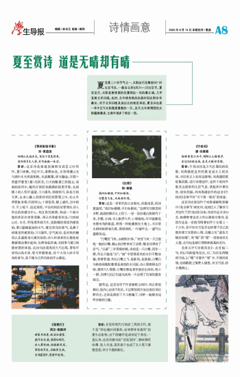 夏至是二十四节气之一,太阳运行至黄经90°时为交节点,一般在公历6月21—22日交节。夏至这天,太阳直射地面的位置到达一年的最北端,几乎直射北回归线,此时,北半球各地的白昼时间达到全年最长。对于北回归线及其以北的地区来说,夏至日也是一年中正午太阳高度最高的一天。这天北半球得到的太阳辐射最多,比南半球多了将近一倍。 《鄂州南楼书事》 宋·黄庭坚 四顾山光接水光,凭栏十里芰荷香。 清风明月无人管,并作南楼一味凉。 赏析:这首诗是黄庭坚被贬官武昌之时所作。夏日夜晚,月近中天,清辉如洗。反射周遭山光与湖中水光相连相映,水波粼粼,碎玉融金;方圆十里盛开着芰(菱)花荷花,白天的酷暑已然褪去,凉爽的夜风中,随风扑面而来满满的轻柔芳香。此刻楼上的人凭栏遥望,习习清风,朗朗明月,似是无拘无束,全身心融入到美好的自然景观之中。先从外界景象来看:四面环山,十里芰荷,楼上清风,空中明月,天上地下,远近高低,宇宙间的层层景物以诗人所在的南楼为中心,相互烘托映照,构成一个极丰富的多层次审美图像。再从自身感受来说:闪烁的山光、水光、明亮柔和的月光,是眼睛的视觉所感到的;夏日温暖湿润的水气、菱花荷花的香气,是鼻子的嗅觉所感到的;习习清风,空气流动,是皮肤的触觉以及温度变化感知到的;诗人和读者的五感统统都被调动集中起来,仿佛身临其境,共同参与夏日南楼夜景的体验。此诗句法简易而大巧出焉,看似平淡而山高水深,更无斧凿痕迹。好个大诗人妙手写来的章句,真不愧为江西诗派的开山鼻祖。 《出郊》 明·杨慎 高田如楼梯,平田如棋局。 白鹭忽飞来,点破秧针绿。 赏析:这是一首明代的五言绝句。语意浅显,而诗意盎然,“高田如楼梯,平田如棋局。”这两句写眼前的田野,高高的梯田从上而下,一层一层沿着山势排列下来,齐整,壮阔,令人眼界大开,心情愉悦;平田就像是有棱有角的棋盘,拼图一样地镶嵌在大地上。水田里水稻刚刚移栽扎根,碧绿绿的,一片铺开去,一望可以望得很远。 “白鹭忽飞来,点破秧针绿。”突然飞来一只白瓷瓶一般的白鹭,静止的田野里有了动景,整首诗便有了活气。“点破”二字用得妙极,来的是一只白鹭,而非一群,所以只能是“点”;“破”字显得原来的水田平整如镜,美得普通,所以白鹭之飞,是破局,是拯救。白鹭白与秧苗绿搭配着便是典型的水田画。诗人观察得也仔细,据我个人观察,白鹭仿佛是喜欢独自出来的,绝少一群,仿佛它自己知道乌泱泱一片会毁了自身的遗世独立。 据考证,这首诗写于作者被贬云南时,所以看到梯田,他内心应该不快乐,不过看到南方如此美好的田野风光,应该是得到了不少慰藉了。田野一般都有这样治愈的力量。 《竹枝词》 唐·刘禹锡 杨柳青青江水平,闻郎江上踏歌声。 东边日出西边雨,道是无晴却有晴。 赏析:竹枝词本是古代巴蜀间的民歌,刘禹锡把这种民歌变成文人的诗体,对后世文人有深远影响。刘禹锡经常收集民歌,进行诗歌创作,这样子的诗作散发出浓浓的生活气息,读起来朴素自然,轻快明丽。而刘禹锡创作的这首《竹枝词》在奉节有“天下第一情诗”的美誉。 这首诗应该创作于刘禹锡被贬到夔州(现在奉节)刺史时,他向巴人了解学习并创作了《竹枝词》诗体,传世作品共有11首。杨柳青青这首之所以被称为情诗,是因为这是一首描写情窦初开少女爱上一个少年,却不知对方是否也钟情于自己的既欢喜又忧愁的心情,点睛之句“道是无晴却有晴”,用“晴”同“情”一语谐音双关之意。此句也是被引用频率极高的名句。 名家点评《诗境浅说》:此首起二句,则以风韵摇曳见长。后二句言东西晴雨不同,以“晴”字借作“情”字,无情而有情,言郎踏歌之情费人猜想。双关巧语,妙手偶得之。 《怨歌行》 西汉·班婕妤 新裂齐纨素,皎洁如霜雪。 裁作合欢扇,团团似明月。 出入君怀袖,动摇微风发。 常恐秋节至,凉飙夺炎热。 弃捐箧笥中,恩情中道绝。 赏析:在没有现代化纳凉工具的古代,扇子是“举处随时消暑热,动来常伴有清风”的夏令必备物。由于班婕妤是成帝妃子身份,一直以来,这首诗被当成“宫廷怨诗”,借咏物叹命薄、佳人失宠,甚至扇子也成了文人笔下凄楚悲怨、怀才不遇的象征。