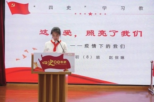 历史是最好的教科书,也是最好的清醒剂。学好党史、新中国史、改革开放史、社会主义发展史,不仅是每位共产党员的一门必修课,也能引导我们少先队员深植爱国主义情怀,“扣好人生第一粒扣子”,做新时代好少年。 记者 曹莹 “好少年”主讲特殊班会课 目前,松江区教育系统“四史”学习教育活动正如火如荼展开,推出了“茸城少年学四史”、“云间教师讲四史”等系列活动。 在松江区中山小学的校园里,有一座抗日少年英雄夏秋生的雕像。夏秋生就读于中山小学的前身杨家桥小学时,因为在方塔墙上写了“打倒日本帝国主义”八个大字,被日军刺死,时年十二岁的夏秋生是目前可以考证的上海境内年龄最小的抗日小英雄。日前,松江区“新时代好少年”——中山小学的薛亚多给同学们带来一节特殊的班会课——《我们的抗日小英雄——夏秋生》。薛同学用诗歌和故事的形式带着大家走近夏秋生,走近他英勇抗日宁死不屈的故事。 据记者了解,中山小学还以夏秋生英雄人物事迹为素材创作了一部反映小英雄爱国主义的课本剧——《我们的小英雄——夏秋生》,通过艺术表现形式让英雄校友爱国、报国的形象更加生动、更加感人。 学生自编微电影讲述历史故事 “绿树阴浓夏日长”,“满架蔷薇一院香。”五月初夏,小满已至,在浦东新区教育系统“四史”学习教育部署动员之际,澧溪中学党支部迅速动作,开展了一系列“四史”学习教育活动。 澧溪中学学生们自编自演了红色微电影——《油画里的故事》。它以时间为序,通过时空穿越的方式逐一展现了从“五四”运动到抗美援朝6个不同历史时期与周浦地区相关的革命历史故事。这部微电影作为澧溪中学本次“四史”学习教育进校园的重要内容,让在场观看的每一位师生都深深被震撼,来自每个分会场教室的掌声久久没有停息。 “学习‘四史’ 致敬英雄” 6月8日,金山区第二实验小学开展了主题为“学习‘四史’ 致敬英雄”升旗仪式。 升旗仪式上,同学们用一组图片、一段朗诵,一起回味了中国少年先锋队的创立者和领导者——中国共产党的历史。从嘉兴南湖共产党第一次代表大会的举行,到南昌起义武装反抗国民党反动派的第一枪的打响,再到邓小平南巡、香港回归,一张张历史照片和漫画从大屏幕上闪过,同学们从画面中看到了中国从站起来、富起来到强起来的伟大飞跃。 援鄂英雄——五(2)中队孟皓睿的爸爸还为大家作了国旗下的讲话。孟爸爸为大家讲述了援鄂时的难忘经历,队员们用心聆听感受党和祖国的强大。