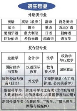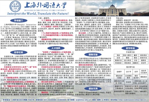 学校简介 上海外国语大学(Shanghai Internation-al Studies University,SISU)创建于1949年12月,是中华人民共和国成立后兴办的一所高等外语学府,是中华人民共和国外语教育的发祥地之一,是教育部直属并与上海市共建、进入国家“211工程”和“双一流”建设的全国重点大学。 上外秉承“格高志远、学贯中外”的校训精神和“诠释世界、成就未来”的办学理念,以“服务国家发展、服务人的全面成长、服务社会进步、服务中外人文交流”为办学使命,致力于建成国别区域全球知识领域特色鲜明的世界一流外国语大学。 办学优势 自建校以来,上海外国语大学始终保持着领先的学科优势和高水平的教学质量,是同类院校中拥有三个一级学科(外国语言文学、政治学、工商管理)博士学位授权点的高校。 上外拥有: 外国语言文学学科列入世界“一流”学科建设名单,教育部学科评估A+评级; 多个学科门类:以语言文学类学科见长,文学、教育学、经济学、管理学、法学、工学等多个门类协调发展; 3个国家重点学科:英语语言文学、俄语语言文学、阿拉伯语语言文学(培育); 1个国家非通用语种本科人才培养基地:西欧语种群(意大利语、葡萄牙语、希腊语、荷兰语); 10个国家级特色专业建设点:英语、德语、法语、俄语、 日语、西班牙语、阿拉伯语、非通用语种群(意大利语、葡萄牙语、希腊语、荷兰语)、非通用语种群(朝鲜语、波斯语、泰语、印度尼西亚语、希伯来语、越南语、印地语、哈萨克语、波兰语)、新闻学; 12个国家级一流本科专业建设点:英语、俄语、德语、法语、西班牙语、阿拉伯语、 日语、波斯语、朝鲜语、翻译、国际政治、工商管理 6个上海高校一流学科:外国语言文学(A类)、应用经济学、政治学、教育学、新闻传播学、工商管理; 1个上海涉外卓越法律人才培养基地:法学; 1个上海卓越新闻传播人才教育培养基地:广播电视学; 高级翻译学院:获国际会议口译员协会(AIIC)全球评级,是包括港澳台地区在内的中国仅有的一个位列世界15强的专业会议口译办学机构。 人才培养 “多语种+”卓越国际化人才培养战略:上外主动服务中国特色大国外交战略、“一带一路”倡议和文化“走出去”重大战略,突出“会语言、通国家、精领域”,推动卓越外语人才、多语种高端翻译人才、多语种国际新闻传播人才、无国界工商管理创新人才、应用经济学国际创新人才、涉外法律人才、国际组织人才的培养。 外语类专业双外语制培养:全面实施“外语专业卓越人才培养计划”,所有外语类专业实行“英语类专业+第二外语”、“专业外语+英语”双外语制教学,所有外语类专业学生都要求参加专业英语四级考试,可报考英语专业八级考试,还开设一系列文化、经济、政治、法律、管理、国际关系等国别区域方向性课程。 复合型专业特色人才培养:上外创新打造复合型专业教学模式,全面实施“专业+英语”培养机制,所有复合型专业学生都要求参加专业英语四级、八级考试。符合要求的学生有机会获得英语辅修专业证书和辅修学士学位。 辅修项目:上外实行跨学科跨专业交叉培养。开设多语种国际新闻人才培养实验班、多语种金融人才培养实验班、多语种涉外法律人才培养实验班、多语种工商管理人才培养实验班等多个“多语种+”人才培养专属平台,拥有德语、法语、日语、英语、新闻学、金融学、法学、工商管理等辅修专业。学生可跨校修读上海市21所高校开设的选修课程及涵盖文学、经济、管理、工学、理学、法学、艺术等学科门类的共40余个辅修专业。 拔尖培养:上外设立卓越学院,培养拔尖人才。卓越学院采用荣誉培养制度,实施荣誉学籍、荣誉课程和荣誉证书三个层面的拔尖创新人才培养机制,通过英语强化制度、国际培养制度和创业实践制度开展全过程强化培养,辅以学业导师制度和旋转流动制度保障人才培养的质量。卓越学院现开设多语种高级翻译人才实验班、多语种国别区域人才实验班、多语种国际组织人才实验班和多语种外交外事人才实验班等。 国际交流 上海外国语大学先后与62个国家和地区的420多所大学和国际组织建立了合作关系,为本科生提供多元国际交流机会。 国际交流类型包括:国家公派留学项目,“优秀本科生国际交流项目”、“政府互换奖学金项目”等。校际交流项目,拥有超过130个校级交流合作项目;联合培养(双学位)项目:拥有本科生2+2双学位项目、研究生1+1+1双学位项目和3+2本硕连读项目;短期(假期)学习、游学、实习项目,国际知名大学开设的各类短期交换项目。 上外设立“上海外国语大学学生海外交流基金”,鼓励学生出国出境开展交流活动。上外本科生出国(境)访学比例高达45%。 就业优势 学校各专业都拥有鲜明的上外特色,毕业生在就业市场上颇受用人单位青睐。 毕业去向: 出国留学:录取世界一流名校; 国内读研:录取国内顶尖院校研究生; 参加工作:广泛就职于外交、外事、外宣、外贸、外语教育和世界知名跨国公司等。包括:国家部委、政府机关和外事机构,国家外宣、教育事业单位;国际、区域联合组织、国际志愿者和公益机构;国家支柱产业的大型国有企业、国内外互联网、高科技产业的前沿公司;世界知名管理咨询公司、国际金融巨头、著名快消业领军企业和其他行业领导者、全球财务管理行业权威事