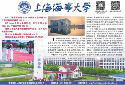 ESI 工程学科位列2019中国高校全球前1%工程学科排行榜第119位 US News世界大学排行榜,位列世界大学1207位、中国大学第117位 连续三年进入泰晤士世界大学排名,位列国内高校第69位 居2019软科中国大学排行榜130位 港航物流学科榜居前(艾斯维尔SCOPUS) 上海海事大学有着悠久的办学历史,可追溯到1909年晚清邮传部上海高等实业学堂船政科。百十年来,学校以“忠信笃敬”为校训,在人才培养、科学研究、社会服务、文化传承、国际交流等方面成就卓然。2019年,学校成功举办中国高等航海教育暨上海海事大学建校110周年庆祝大会、首届世界海事大会以及第二届顶尖科学家论坛。 学校2013年成立中国(上海)自贸区供应链研究院和上海高级国际航运学院。上海高级国际航运学院采取国际上先进的商学院运作模式,与全球优秀教育机构资源共享,着力打造国内领先、国际知名的航运金融教育品牌,构筑具有影响力的航运高端人才输出基地。 学校与境外100余所姐妹院校建立了校际交流与合作关系,开展教师交流、合作办学、合作科研、学生交换等。与联合国国际海事组织、波罗的海国际航运公会、挪威船级社等国际知名航运组织/机构建立了密切联系。自2010年起开设“国际班”,邀请美国、韩国、波兰、俄罗斯、德国等国家航海院校的学生来校学习“航海技术”“航运管理”等专业。 近年来,我校毕业生就业率始终保持高位稳定,先后获得“全国高校就业50强”、上海市促进就业先进集体、上海高校毕业生就业工作创新基地等荣誉称号。目前,学校已向全国港航企事业单位及政府部门输送了毕业生逾16万,被誉为“高级航运人才的摇篮”。 学校地址:上海市浦东新区海港大道1550号 咨询电话:021-38284395 本科招生网:http://admission.shmtu.edu.cn
