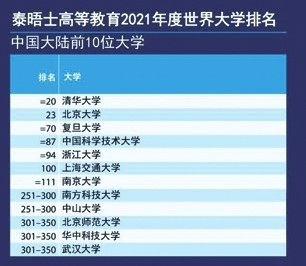 本报讯 近日,泰晤士高等教育发布了2021年泰晤士高等教育世界大学排名。