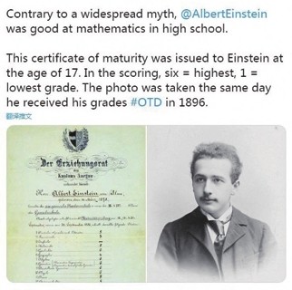 近日,2020年诺贝尔奖颁奖正如火如荼进行中,网络上却有传言称“著名物理学家、诺贝尔物理学奖得主爱因斯坦高中时数学不好”。 这一传言惊动了诺贝尔奖官方。为此,诺贝尔奖官方推特账号于10月3日公布了爱因斯坦1896年就读于瑞士阿劳市高中时的成绩单。2019年在上海举办的“启初·天才相对论——爱因斯坦的异想世界”特展中,这张成绩单也曾被展出过,看过展览的小伙伴一定不陌生。 在当时的评分标准中,6分为最高分,1分为最低分。成绩单显示,爱因斯坦的代数、几何、投影几何、物理、历史5科全部都是6分;德语语言文学、意大利语语言文学、自然历史、化学等科目得5分;即使是地理、绘画、工业绘图也取得了4分;最差的是法语语言文学,只有3分。 与传言中的“数学不好”恰恰相反,爱因斯坦在高中是一个不折不扣的学霸,而且文理俱佳,后来他凭借优异的成绩进入瑞士顶级学府苏黎世联邦理工学院。 其实,这不是诺贝尔奖官方第一次针对这一传闻辟谣。在2019年2月22日,诺贝尔奖就通过官方推特,发过一张和上文一模一样的爱因斯坦高中成绩单照片。 但每年诺奖颁布时,类似的传言总会被人翻出来炒作一番,以此博眼球赚流量。 来源:澎湃新闻