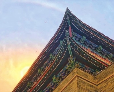 作品从建筑物的边角处,以仰视的角度拍摄的,同时日落晚霞正好在建筑物的上方,两者融合有一种唯美感,日落探出半个头,望着相机,特别生动,颜色也很暖,衬托出建筑物的装潢,美不胜收。