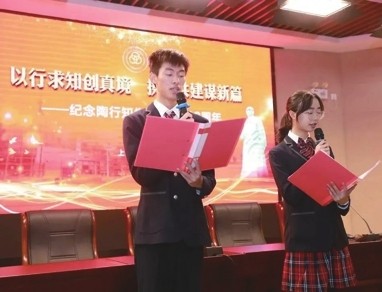 记者 郭漪 “捧出一颗丹心,献予亿兆生灵!”行知中学的齐天和张锦玥同学的朗诵《大爱之歌》让现场听众动容,这是对陶行知先生丰功伟绩的高度赞美,更蕴涵全体行知人最崇高的敬意。近日,为纪念陶行知先生诞辰129周年,行知中学举行纪念陶行知先生诞辰129周年暨主题党日活动,并与陶行知纪念馆签订共建协议。这份合作共建协议,将以“资源共享、优势互补、相互促进、共同提高”为目的,坚持“互联、互补、互动”,在理论研讨、主题教育等多个方面开展合作。 活动中,陶行知纪念馆副馆长陆黎明带领在场师生重温了陶行知先生的名言“人生为一大事来,做一大事去”,并寄语行知学子要继承和发扬陶先生的奉献精神和求真精神,刻苦学习,加强修养,磨炼意志,坚定信念,用实际行动服务社会,报效祖国。 活动最后,全体人员来到行知中学爱满广场。行知中学校长杨卫红和学生会主席韦润雨同学共同向陶行知先生塑像敬献花篮。全体师生向陶行知塑像三鞠躬,表达对行知先生深深的缅怀与崇敬之情。 据了解,行知中学前身是伟大的人民教育家陶行知先生于1939年在重庆创办的育才学校,陶行知任首任校长,抗战胜利后学校由重庆迁往上海。1978年,学校被批准为全市26所市重点中学之一。