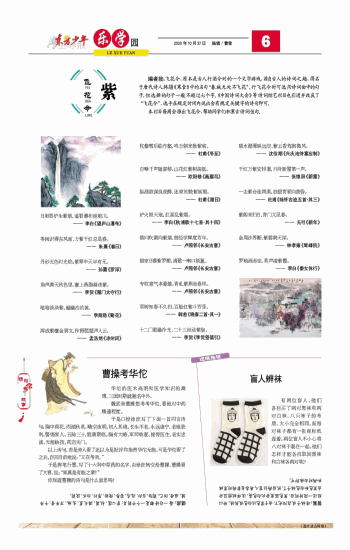 编者按:飞花令,原本是古人行酒令时的一个文字游戏,源自古人的诗词之趣,得名于唐代诗人韩翃《寒食》中的名句“春城无处不飞花”。行飞花令时可选用诗词曲中的句子,但选择的句子一般不超过七个字。《中国诗词大会》等诗词综艺栏目也引进并改良了“飞花令”,选手在规定时间内说出含有规定关键字的诗句即可。本栏目每周会推出飞花令,帮助同学们积累古诗词佳句。 日照香炉生紫烟,遥看瀑布挂前川。 —— 李白《望庐山瀑布》 等闲识得东风面,万紫千红总是春。 —— 朱熹《春日》 丹砂五色时光焰,紫翠中天半有无。 —— 孙蕡《罗浮》 角声满天秋色里,塞上燕脂凝夜紫。 —— 李贺《雁门太守行》 暗暗淡淡紫,融融冶冶黄。 —— 李商隐《菊花》 浑成紫檀金屑文,作得琵琶声入云。 —— 孟浩然《凉州词》 杖藜雪后临丹壑,鸣玉朝来散紫宸。 —— 杜甫《冬至》 百啭千声随意移,山花红紫树高低。 —— 欧阳修《画眉鸟》 纵酒欲谋良夜醉,还家初散紫宸朝。 —— 杜甫《腊日》 炉火照天地,红星乱紫烟。 —— 李白《秋浦歌十七首·其十四》 借问吹箫向紫烟,曾经学舞度芳年。 —— 卢照邻《长安古意》 娼家日暮紫罗裙,清歌一啭口氛氲。 —— 卢照邻《长安古意》 专权意气本豪雄,青虬紫燕坐春风。 —— 卢照邻《长安古意》 草树知春不久归,百般红紫斗芳菲。 —— 韩愈《晚春二首·其一》 十二门前融冷光,二十三丝动紫皇。 —— 李贺《李凭箜篌引》 碧水澄潭映远空,紫云香驾御微风。 —— 沈佺期《兴庆池侍宴应制》 千红万紫安排著,只待新雷第一声。 —— 张维屏《新雷》 一去紫台连朔漠,独留青冢向黄昏。 —— 杜甫《咏怀古迹五首·其三》 紫阁未归日,青门又见春。 —— 无可《新年》 金周沙界断,紫碧洞天深。 —— 林孝雍《鹫峰院》 罗袖洒赤血,英声凌紫霞。 —— 李白《秦女休行》