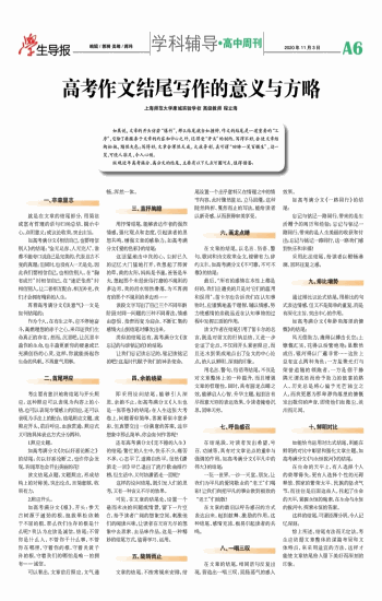 上海师范大学康城实验学校 高级教师 程立海 如果说,文章的开头仿若“爆竹”,那么结尾就当如撞钟。作文的结尾是一道重要的“工序”,它除了要服务于文章的内容和中心之外,还得受“开头”的制约。写得不好,会使文章结构松弛,黯然失色;写得好,文章会浑然天成,大放异彩,真可谓“回眸一笑百媚生”。这一笑,可使人驻足,令人心动。 纵观近年高考满分、高分文的结尾,主要有以下几点可圈可点,值得借鉴: 一、卒章显志 就是在文章的结尾部分,用简洁或富有哲理的语句归纳总结,揭示中心,点明意义;或议论收束,突出主旨。 如高考满分文《相信自己,也要相信别人》的结尾:“金无足赤,人无完人”,谁都不能夸口说自己是完美的,代表亘古不变的真理;但同时,也没有人一无是处,因此我们要相信自己,也相信别人。在“胸有成竹”时相信自己,在“迷茫怅然”时相信别人,让二者相互配合,相互补充,我们才会拥有精彩的人生。 再看高考满分文《谈意气》一文是如何结尾的: 作为个人,在有生之年,应不停地奋斗,高燃理想的赤子之心,来印证我们生命真正的存在。然而,沉思吧,让沉思丰盈你的生命,也丰盈更新你的疲惫或已充满创伤的心灵,这样,你就能扬起你生命的风帆,不再意气用事。 二、首尾呼应 考生要有意识地将结尾与开头照应。这种照应可以表现为内容上的小结,也可以表现为情感上的回应,还可以表现为手法上的配合。结尾照应文题,或照应开头,前后呼应,血脉贯通。照应式又可按具体表达方式分为两种。 1.照应文题。 如高考满分文《勿以好恶论断之》的结尾:勿以好恶论断之,也许你会发现,狗尾草也会开出美丽的花! 该文结尾点题,文题照应,形成结构上的对称美,突出论点,言简意赅,收束有力。 2.照应开头。 如高考满分文《根》,开头:参天古树源于遒劲的根,挺拔翠松依赖于不屈的根,那么我们生存的根是什么呢?我认为应该是诚信。结尾:不管你是什么人,不管你干什么事,不管你在哪里,守着你的根,守着炎黄子孙的根,守着我们的哪怕是唯一的拥有——诚信。 可以看出,文章前后照应,文气通畅,浑然一体。 三、直抒胸臆 用抒情结尾,能够表达作者的强烈情感,强化观点和态度,引起读者的思想共鸣,增强文章的感染力。如高考满分文《爱的色彩》的结尾: 这话猛地击中我的心,尘封已久的记忆大门猛地打开。我想起了那黄的草,黄的太阳,妈妈是书童,爸爸是车夫,想起那个未经世俗打磨的不规则的多边形,我的泪水悄然滑落,为不再拥有的那个不规则的多边形…… 该段文字写出了自己三个不同年龄阶段对同一问题的三种不同看法,情感由怨恨、指责而变为迎合,不断汇集的感情火山到结尾时爆发出来。 类似的结尾还有,高考满分文《该忘记的与该铭记的》的结尾: 让我们忘记该忘记的,铭记该铭记的吧!这是时代赋予我们的神圣使命。 四、余韵绕梁 即采用设问结尾,能够引人深思,余韵不止。如高考满分文《人生也是一张答卷》的结尾:在人生这张大考卷上,问题看似简单,答案看似丰富多彩,但真要交出一份满意的答案,远非想象中那么简单。你会如何作答呢? 还有高考满分文《走不倦的人生》的结尾:繁忙的人生中,快乐不少,痛苦不多。心态平了,道路自然平。虽然《潇洒走一回》早已退出了流行歌曲排行榜,但生活中,又何妨潇洒走一回呢? 这样的设问结尾,既引发人们的思考,又有一种言义不尽的效果。 可见,在文章的结尾处,设置一个悬而未决的问题或情景,留下一片空白,给予读者广阔的想象空间,刺激他们的阅读兴味,让读者在无穷无尽的想象中去思索、去品味作品,这是一种精妙的结尾方式,值得学习、运用。 五、陡转而止 文章的结尾,不按常规来安排,结尾设置一个出乎意料又在情理之中的情节内容,此时骤然驻足,立马回缰。这种陡然转折、戛然而止的写法,能给读者以新奇感,从而获得审美享受。 六、画龙点睛 在文章的结尾,以名言、俗语、警句、歌词和诗文收束全文,铿锵有力,辞约义丰。如高考满分文《不可靠,不可不靠》的结尾: 最后,“所有的感情在本性上都是好的,我们应避免的只是对它们的滥用和误用”。笛卡尔也告诉我们在认知事物时,应谨慎地基于理智,辅以情感,努力使感情的亲疏远近在认知事物的过程中发挥正面的作用。 该文作者在结尾引用了笛卡尔的名言,既是对前文的归纳总结,又进一步论证了论点,不仅同开头紧密照应,而且还水到渠成地点出了全文的中心论点,给人以鲜明、深刻的印象。 用名言、警句、俗语等结尾,不仅是对文章整体上的一种提升,而且增强文章的哲理性。同时,具有画龙点睛之效,能够启人心智、升华主题,起到言有尽而意无穷的表达效果,令读者掩卷沉思,回味无穷。 七、呼告感召 在结尾段,对读者发出希望、号召、劝诫等,具有对文章论点的重申与强调的作用。如高考满分文《平凡中的伟大》的结尾: 一花一世界,一沙一天堂。朋友,让我们为平凡的爱岗敬业的“老王”们喝彩!让我们向把平凡的事业做到极致的“老王”们致敬! 在文章的最后以呼告感召的方式表达出来,起到鼓舞、激励的作用。这种结尾,感情充沛,极易引起读者的共鸣。 八、一唱三叹 在文章的结尾,相同语句反复出现,营造出一唱三叹、回肠荡气的感人效果。 如高考满分文《一路同行》的结尾: 忘记与铭记一路同行,带来的是生活赠予