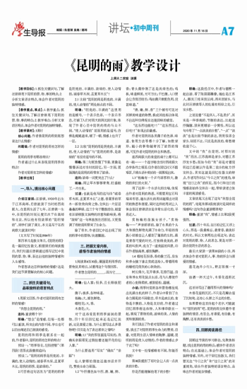 上师大二实验 汤嫄 【教学目标】:1.抓住关键词句,了解汪曾祺笔下昆明的景、物、事的特点;2.分析文章语言特点,体会作者对昆明的独特情感。 【教学重点、难点】:1.教学重点:抓住关键词句,了解汪曾祺笔下昆明的景、物、事的特点;2.教学难点:分析文章语言特点,体会作者对昆明的独特情感。 【教学课时】:1课时 核心问题:作者借昆明的雨到底想表达什么情感? 问题链:作者对昆明的雨有怎样的情感? 昆明的雨季有哪些特点? 作者通过什么来表现昆明雨季的特点? 作者对昆明有怎样的情感? 【教学过程】 一、导入,提出核心问题 介绍汪曾祺:汪曾祺,1920年出生于江苏高邮,后曾就读于当时的西南联大,在昆明生活了七年。汪曾祺一生中,在昆明的时间长度仅次于在高邮和北京,所以他有很浓厚的“昆明情结”。同学们读了课文,本文是写于在西南联大就读时吗? (文末写了时间是1984年) 第四单元是散文单元,《昆明的雨》是一篇回忆性散文,根据课后的阅读提示,我们知道汪曾祺通过描写记忆中昆明的景、物、事,表达出他的独特情感和人生感悟。 作者想表达怎样独特的情感?这是我们这节课要解决的核心问题。 二、抓住关键语句,品味独特的语言特点 1.用原文回答,作者对昆明的雨有怎样的情感? “我想念昆明的雨。” 追问:重读哪个字? 明确:“想念”是情感,但每一处都可以重读,所突出的内容不同,学生也可以自由阐述自己朗读的感受。 昆明的雨和雨季是联系在一起的,作者眼中,昆明的雨有怎样的特点? 预设一:“雨季很长,但很舒服”(第四段)若答此段继续追问; 预设二:“昆明的雨季是明亮的、丰满的,使人动情的。城春草木深,孟夏草木长。昆明的雨季,是浓绿的。” 2.可否将这句话改为“昆明的雨季是明亮的、丰满的、浓绿的、使人动情的。城春草木深,孟夏草木长”? 2.1 比较“昆明的雨是明亮的、丰满的,使人动情的”两处标点的不同。 明确:“明亮的、丰满的”这里用的是顿号,一个表示色彩,一个表示形态,打破了人们对雨天的阴沉的印象,体现了作者心目中昆明的雨的与众不同。“使人动情的”前面用的是逗号,仿佛是娓娓道来,顿了一顿,情感上也升了一层。 2.2 比较“昆明的雨是明亮的、丰满的,使人动情的”与“昆明的雨季,是浓绿的”有没有逗号的不同。 明确:第二句更放慢了节奏,更像是慢慢诉说对当时的回忆。另一方面,更强调的是昆明的雨带来了浓绿。 追问:浓绿一词更突出了什么? 明确:雨让草木郁郁青青,旺盛极了,一片生机。 过渡:也就是他写的这句诗“城春草木深,孟夏草木长”之意,春夏季的草木一派欣欣向荣之势,交织出一片层层叠叠的翠绿。这三个句子整散结合,极富有汪曾祺散文独特的诗意和韵味美。将“浓绿”这一句单独放在后面说,又更强调了雨给昆明带来了生命力。 除了草木,作者回忆中还出现了别的雨季中的景物,快速圈画。 三、把握文章内容,感悟作者独特的情感 1.阅读第6至10段,圈画昆明雨季的景物及其特点,试着用这个句型回答。 作者想念昆明的___________,因为它___________。 明确:仙人掌;很多,且长得极肥大。 菌子;极多,各种味道。 杨梅;大,颜色鲜艳。 缅桂花;大,香。 木香花;大。 对于这些受昆明雨季滋润的景物,四十年后回忆起来还是记忆犹新,足见喜爱之情。为什么要写这么多景物呢?仅仅是为了表达喜欢之情吗? 明确:1.1“我的那张画是写实的。我确实亲眼看见过倒挂着还能开花的仙人掌。” 为什么要连用“写实”“确实”“亲眼”? 仙人掌哪怕倒挂还能存活并开花,赞美生命力顽强。 1.2“牛肝菌色如牛肝,滑、嫩、鲜、香;青头菌炒熟了还是浅绿色的;鸡枞,味道鲜美,无可方比;干巴菌,入口便会让你张目结舌;鸡油菌只做配色用,没甚味道。” “滑、嫩、鲜、香”三个顿号可见对其鲜美味道的称赞,换成其他标点体现不出这种仿佛现在还能回味的感觉。 “这东西也能吃?!”“这东西这么好吃?!”体现出自豪感。 作者对昆明的各类菌子的色泽、味道、食用方法等都十分了解,如数家珍。越小的事物越寄托了浓烈的情感,可见作者对昆明的怀念和熟悉。 连西南联大的食堂的桌子上都可以有一碗——一个连字暗含当时西南联大办学条件之艰苦,但作者在回忆时又不提艰苦,只将生活中美好的一面展现出来。 1.3“杨梅有一个乒乓球那样大,像烧的炽红的火炭。” 用了这样一个生活化的比喻,体现出作者对昆明的熟悉,不需要用宝石玛瑙来形容,越生活化的用词越看出对昆明的熟悉和喜爱。同时这样的用词让人体会到汪曾祺语言是非常生活化的,平易近人。 卖杨梅的苗族女孩子,“卖杨梅——”声音娇娇的。除了水果的个头大和颜色鲜艳充满了生命力,年轻的苗族小姑娘也让人感到了蓬勃的生机,最是青春可爱的时光,打扮得美美的,娇柔的叫卖声,成为了一道美丽的风景,印在作者脑海里,感到陶醉。 1.4 缅桂花很香,香的像兰花,房东和养女摘下拿去卖或送给人,带着雨珠的缅桂花使我的心软软的。 树长得大,花开得多,花香四溢,房东和养女用花装点生活,花与人都使作者的心变得柔软,感到轻松、温暖。 小结:雨季时昆明各种景物都呈现出充满生机的样子,作者从中看到了生命力展现的不同姿态,草木是疯长的,食物是丰腴的,人物是友好的,作者通过回忆雨季将这些物、人和事串联在一起,展现了景物的美,滋味的美、人