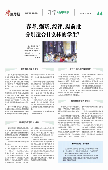春考适合什么样的学生?秋考里的强基计划、综合评价、提前批是怎么回事?今天我们来给大家科普一下。 文 郭漪 春考越来越受到重视 近年来,春考越来越受到高三考生及家长们的重视。首先,对于绝大多数的考生而言,春考都是一次奔向理想高校的机会。其次,春考在考试流程、考场规则、考场环境、考试氛围上都与秋考保持了高度一致,是一次绝佳的实战演练的机会。 从2020年的信息来看,春考共有23所院校招生,其中有1所211大学,8所原一本高校(含一二本都招)、9所原二本高校、5所民办高校。2021年春考招生院校目前还没有公布,根据往年的规律,一般不会做很大调整,具体以考试院公布为准。 春考只考语数外大三门,不考小三门,因此比较适合小三门成绩非常薄弱的学生。此外,春考招生学校都是上海高校,因此也比较适合只考虑本地高校,坚决不去外地读书的学生。在春考中,面试占一定比重,因此面试沟通能力很重要。 春季考试科目为“统一文化考试+院校自主测试”。统一文化考试科目为语文、数学、外语三门科目,其中,语文、数学每科目总分150分。外语科目考试分为笔试(含听力)和听说测试,笔试(含听力)分值为140分,听说测试分值为10分,总分150分。外语科目即为高考的英语一考。 春考是投档到专业的,每名考生只能填报2个专业志愿,可以是同一所学校的2个专业,也可以是不同学校的各1个专业。如果同时被录取,则要面临选择的问题。 需要注意的是,假如春考被录取了,就不能参加秋考。 强基计划代替了自主招生 基础学科招生改革试点,也称强基计划,是教育部开展的招生改革工作,主要是为了选拔培养有志于服务国家重大战略需求且综合素质优秀或基础学科拔尖的学生。自2020年起代替原有的自主招生。 2020年有以下院校参与了强基计划招生试点: 北京大学、中国人民大学、清华大学、北京航空航天大学、北京理工大学、中国农业大学、北京师范大学、中央民族大学、南开大学、天津大学、大连理工大学、吉林大学、哈尔滨工业大学、复旦大学、同济大学、上海交通大学、华东师范大学、南京大学、东南大学、浙江大学、中国科学技术大学、厦门大学、山东大学、中国海洋大学、武汉大学、华中科技大学、中南大学、中山大学、华南理工大学、四川大学、重庆大学、电子科技大学、西安交通大学、西北工业大学、兰州大学、国防科技大学。 强基计划重点在数学、物理、化学、生物及历史、哲学、古文字学等相关专业招生。大部分学生都可以报名,但部分学校严格规定不能转专业,因此学生需要结合自身发展考虑,同时学校会给有省级、国家级的奖项的学生降低门槛,有相关经历的学生也可考虑。 高考后,出分前,高校会对初审通过的学生进行校测,85%高考+15%校测(含笔试面试体测等)择优录取。 综合评价对考名校很重要 综评批次是高考进入名校时一个重要的途径,2020年复旦、交大在综评批次的招生计划占总计划数的90%左右,复医、交医、同济50%以上,其他为6%~30%不等。 2020年有11所高校在沪参与综合评价批次招生,分别是: 复旦大学、上海交通大学、同济大学、华东师范大学、上海财经大学、上海外国语大学、华东理工大学、东华大学、上海大学、上海中医药大学、浙江大学。 2020年起,综合评价录取依据为高考成绩85%+面试成绩15%。高考成绩公布后,各院校专业组会按照平行志愿投档规则,按综评招生计划1:1.5划定面试入围分数线。考生最多只会收到一所学校的面试入围通知。 提前批的专业种类很多 提前批是位于综评和普通批之间的一个录取批次,只要考生没有填报艺体批志愿,基本上是人人皆可填报。 当然,有填报资格不代表每个提前批的专业组都可以填。在提前批招生的院校有一类是军事、公安类院校,这些院校通常都会对考生有政审、体检、性别等要求,具体大家可以参考招生目录上的备注。 提前批的另一大块就是一些特殊专业。以师范类、小语种类专业为主,前者最典型的是华师大,后者包括复旦、财大、上外等。此外医学院通常都会将护理类专业放在提前批招生。 还有一些院校需要在学校官网提前报名,获得优惠后在第一志愿填报,如上纽大、昆山杜克、南科大等等。目前上纽、昆杜都开放了报名通道,感兴趣的高三学生及家长可自行前往学校官网了解。 提前批采用顺序志愿的录取方式,高校先对所有第一志愿填报本校的学生进行排序,按分数从高到低录取。如果第一志愿已招满,则不再继续检索第二志愿填报的学生。 ■录取顺序多了解多权衡 以上录取先后顺序为:春考→强基计划→综合评价(秋考)→零志愿(秋考)→提前批/艺体批(秋考)→地方农村专项(秋考)→特殊类型(秋考)→普通本科批(秋考)。 被上一个批次录取,后续志愿则失效,所以同学们在填报每个批次的时候一定要多考虑,多了解,多权衡,哪个批次的院校专业是最适合你的哦~
