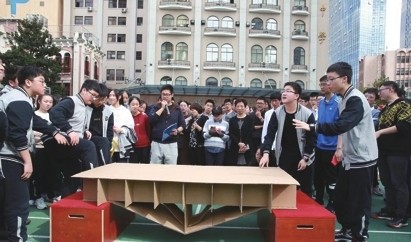 记者 郭漪 不久前,光明中学学子们期盼已久的科技节到来了,高一年级的“DIY创意纸桥”、高二年级的“纸绳拔河”项目,都深受同学们好评。 参与“DIY创意纸桥”的同学,需要用四张瓦楞纸自主设计并制作一座创意纸桥。 随着老师一声令下,各班级代表队成员纷纷带着自己精心制作的纸桥闪亮登场。只见他们首先小心翼翼地把纸桥搭在桥墩上,然后根据分工,有的队员负责压住桥墩,有的队员则负责“测试”桥面的抗压能力。他们都在拼劲全力试图让自己的桥面能够站上更多的人,因为最终桥面上站得最多人的一组将夺得桂冠。 而在“纸绳拔河”比赛,各班的同学必须以报纸为材料,制作纸绳用作拔河使用,拔河过程中若纸绳断裂或中间的铁环拉过记分线则比赛结束,该项目采取积分制。 无论是拔河的过程还是纸绳的制作,无论是纸桥的设计还是建造,都离不开同学们的聪明才智和团结合作。“搭的是纸桥,铸的是‘心桥’。”参加比赛的同学事后感慨,最大的收获是团队合作精神。