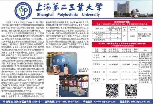 上海第二工业大学成立于1960年,是一所以工科见长、管经文理艺多学科协调发展的市属普通高等学校。学校下设工学部、文理学部、经济与管理学院、国际交流学院及应用艺术设计学院等。 应用艺术设计学院开设视觉传达设计、环境设计、产品设计及数字媒体艺术四个艺术类本科专业,学院以培养高技能、应用型设计人才为目标,在教学中注重培养学生的现代设计理念、方法及实践能力。教学形式上强调“产学联动、应用落地”,将市场需求、企业项目融入教学培养过程,教学成果由校企联合评定。其中产品设计专业获批国家“双万计划”上海市一流本科专业,上海市“应用型本科试点专业”和“一流本科建设引领计划”。 学院不断探索“工作室制”教学模式,在谋求专业特色之路的同时,创新专业课程建设和教改项目。学院“大师工作室”教学模式初显成效,通过社会优质设计资源的引进,使应用型培养模式更具实用性、市场性和先进性。学院注重师生国内外先进设计理念和技术的学习,定期引进国内外专家来院担任课程教学、设立工作坊;学院积极搭建学生海外交流平台,和芬兰、英国、美国、意大利、德国等国家的设计院校建立合作交流关系,目前已经开设了“3+1”、短期交流等合作项目。以校外实习基地为平台的校企合作模式取得了可喜的成效,学院和 “中国自行车协会”、“上海轻工协会”、“得力集团”、“上海家化”、“设计中国”等多家单位建立长期的校企合作关系。 多年来,在全体师生的共同努力下,学院在学科建设、专业建设、设计专利及国内外各类设计竞赛竞标等活动中屡屡获奖。如:第48届世界乒乓球锦标赛会徽和吉祥物的设计中标;第十四届国际泳联世界锦标赛会徽和吉祥物的设计中标;世博会公众参与馆标志设计奖中标;全国大学生广告艺术大赛一等奖;中国包装创意设计大赛金奖;德国红点奖和中国红星设计奖等,在产品设计和工业设计领域中,多个项目荣获上海国际工业博览会奖项,许多产品设计被企业采纳并投入批量生产。此外,学院师生还参与设计了许多具有广泛社会影响的项目,有百余项产品设计获得国家设计专利。 学校地址:浦东新区金海路2360号 咨询电话:50217411、50214975 学校官网:www.sspu.edu.cn 招生官网:zsb.sspu.edu.cn招办微信公众号