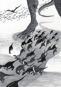作者:刘虎 出版社:人民文学出版社 天天出版社 >>> 内容简介 《终极恐龙》是一部长篇科幻小说,作品围绕“白垩纪生物大灭绝”进行了大胆猜想,将故事舞台搬到一颗名为玛若的星球上,讲述了玛若星球上恐龙的出现、繁荣、灭绝,以及星球进化等一系列事件,探讨了关于生命的意义这一深刻的主题。 玛若星球原本遵循着物竞天择与循环食物链的大自然精华法则有序运行着,弱小的蜥蜴族群族长如米立誓要让蜥蜴一族成为星球上的霸主,不再遭受其他大型猛兽、猛禽的欺压。但经过一系列的抗争后,如米还是失败了,只好带领蜥蜴们离开平原森林逃亡到沙漠深处。在沙漠里,如米他们遇到了自称是“老本家”的外星蜥蜴一族,外星蜥蜴是高度进化的智慧生命体,拥有大量科技设备和武器。外星蜥蜴引诱如米接受了放射线的基因改造,将一部分玛若星球的原生蜥蜴改造成了恐龙。为了达到自己占领玛若星球的邪恶目的,外星蜥蜴将玛若星球上的鱼类和禽类也进行了变异改造,成为陆地恐龙、翼龙、鱼龙的三个族群自此斗争不断,放射线也污染了整个玛若星球。最终,如米他们幡然悔悟,并联合星球上所有的物种团结起来战胜了外星蜥蜴。满目疮痍的玛若星球也在皑皑白雪中重启自然进化之路。 >>> 内文节选 “要是有一种方法,能够让我变成这个世界上最强大的生物我愿意为此付出任何代价。”这是如米人生中的第一个愿望。 那时候的如米,是真正的如米。那时候的如米,还是一个孩子。如米生在一颗名叫玛若的星球上。玛若是宇宙中极其罕见的适合生命存在的星球。 星球上有品种丰富的动物:天上飞的,地上跑的,水里游的,草壳里蹦的,寄生在别人身上的,潜伏在地下的。陆地上很深很深的洞穴内,还生活着一种奇特的啮齿类动物,因为他们的洞穴都安在快要接近玛若心脏的岩石之中,所以,他们的名字就叫岩鼠,至于他们是如何诞生的,当时还不清楚。当大家逐渐重视他们的存在时,他们已经成为玛若星球的主角之一了。 玛若星球上还有数不清的植物,森林,草原,各种灌木花卉,还有苔;有的植物生长在陆地,有的生长在水中。 星球上有河流、湖泊、海洋,有山川和平原,当然,也有戈壁和沙漠,高耸入云的雪山,还有阳光和空气,星球的两极是厚厚的冰层。 罕见的玛若星球在茫无涯际的宇宙中很不起眼。她个头不大,自己不会燃烧,自然也就不能发光。简单地说,玛若就像一块普通的石头,在漆黑的宇宙中,要是没有光照着,就没有谁能看见她。但如果一不小心撞上去,保准让你粉身碎骨。宇宙中有很多这样的星球。当然,这只是动植物出现之后的玛若星球。玛若星球诞生的早期,也是可以发光的。她的光,来源于自身的燃烧。早期的玛若星球上到处都是活跃的火山,不时还有外来星系坠落在上面,将她撞击得满目苍夷。伴随岩浆喷发,挥发出大量的有害气体,没有生物能在这样的星球上生存。这也是宇宙中多数星球过去、目前和未来的状况。过了三十多亿年,多数岩浆逐渐冷凝,多数火山停止爆发,玛若星球才渐渐平静下来。平静后的玛若是幸运的,她有一颗照耀自己的恒星,恒星的名字叫赤鸦。赤鸦是一只巨大的鸟,她拉着一架硕大的车,车上装载着一颗光芒四射的大圆球。赤鸦周围有很多行星,她靠着车子里那颗发光的圆球为这些行星提供光,提供热,使他们避免像多数行星那样,沉沦在无边的寒冷和黑暗之中。 赤鸦的众多行星中,只有玛若星球上有生命,这是因为她和赤鸦的距离适中。那些太近的,被烤成了焦土;太远的,光照时间短,被冻成了冰球。 >>> 专家点评 作为一部具有科幻内容的童话小说,《终极恐龙》讲述了何为真正的强大。对生命本身的形态予以尊重,不是一种懦弱,反而在这个基础的成长与突破才是一种真正意义上的强大。这种强大不是建立在欺凌之上,也不是通过各种不义途径巧取豪夺,而是一种面对现实的自我成长与进步,是不侵犯他人利益的共赢与成熟。 小说以动物喻人,用寓言的形式写作,将成长的道理蕴藏其中,符合儿童的接受心理,在增加阅读兴趣的同时可以引发思考。小说包含大量的科幻情节,特别是涉及到沐恩星球的科技介绍时,有很强的科幻意味,表现出了作者丰富的想象力。语言方面,小说结合现代时尚元素与古典美,笔触时髦且幽默,易于儿童阅读并接受。 ——著名学者、出版人、中国韬奋基金会理事长 聂震宁