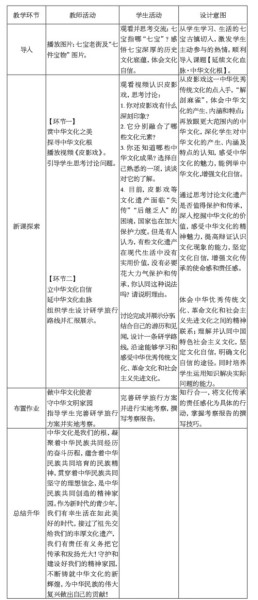 上海市文来中学(初中部) 项瑞芳 一、教材分析 《中华文化根》是部编人教版《道德与法治》九年级上册,第三单元《文明与家园》第五课《守望精神家园》第一框《延续文化血脉》的第一目。本目主要阐述了中国特色社会主义文化是中华文化的血脉延续,我们要坚定文化自信,发展中国特色社会主义文化。本目内容作为第三单元的开篇,在本单元中起到了统领作用:深入认识和理解中华文化根,是认识和传承中华优秀文化及其蕴含的美德、民族精神和社会主义核心价值观的前提,是涵养民族精神、社会主义核心价值观的深厚基础,是守望和建设我们的精神家园、共筑生命家园的必要条件,也是实现中华民族伟大复兴的精神基础和动力。 本目所依据的课程标准的相应部分是“我与国家和社会”中的“积极适应社会的发展”和“认识国情,爱我中华”。具体对应的内容标准是“感受个人成长与民族文化和国家命运之间的联系,提高文化认同感、民族自豪感,以及构建社会主义和谐社会的责任意识”;“学习和了解中华文化传统,增强与世界文明交流、对话的意识”。 本框内容所依据的党的十九大精神主要有以下两个方面。其一,党的十九大报告第三部分“新时代中国特色社会主义思想和基本方略”中的“坚持社会主义核心价值体系。文化自信是一个国家、一个民族发展中更基本、更深沉、更持久的力量。必须坚持马克思主义,牢固树立共产主义远大理想和中国特色社会主义共同理想,培育和践行社会主义核心价值观,不断增强意识形态领域主导权和话语权,推动中华优秀传统文化创造性转化、创新性发展,继承革命文化,发展社会主义先进文化,不忘本来、吸收外来、面向未来,更好构筑中国精神、中国价值、中国力量,为人民提供精神指引”。其二,党的十九大报告第七部分“坚定文化自信,推动社会主义文化繁荣兴盛”中的“要坚持中国特色社会主义文化发展道路,激发全民族文化创新创造活力,建设社会主义文化强国”。 二、学情分析 随着年龄的增长和知识的积累,我校学生对中华文化并不陌生,尤其是生活、学习在千年古镇七宝及以“人文立校、主动发展”为办学特色的文来校园里,学生可以通过社会及学校组织的“校园文化艺术节”等多种途径感知到中华文化;同时,部分学生也掌握了某些传统文化技艺,参观过文化景点等。但是,九年级学生的世界观、人生观及价值观仍处于形成的关键期,尤其是身处上海这一国际大都市,各种各样的文化相互激荡,学生受其心理发展水平和认识能力及辨别是非能力的限制,在一定程度上会淡漠对中华优秀文化价值的认识,从而影响对中华传统文化的继承与发展。本目内容从分析中华文化的来源、内涵、特点及价值的视角,对学生如何坚定文化自信、发展中国特色社会主义文化提出了要求,而学生对中华文化的价值缺乏深入的认知和思考,是本课教学的难点所在。 三、教学目标 通过学习和探究,感受中华文化的魅力,认同中国特色社会主义文化,热爱、传承并弘扬中华文化,坚定文化自信。提高对中华文化的认知和运用能力;立足于社会主义先进文化,提高辩证认识文化现象的能力,并能做出符合文化自信要求的判断和选择。理解中华文化的特点、内涵和价值;了解中华优秀传统文化、革命文化和社会主义先进文化三者之间的精神联系;理解文化自信的意义,明确坚定文化自信的途径。 四、教学重难点 重点:坚定文化自信,发展中国特色社会主义文化; 难点:中华文化的价值。 五、教学技术与学习资源的应用 1.教学技术:PPT、小视频 2.教学资源:学生搜集七宝及相关的文化资源,设计研学旅行路线;教师收集中华文化相关的教学资源,制作小视频。 六、教学过程