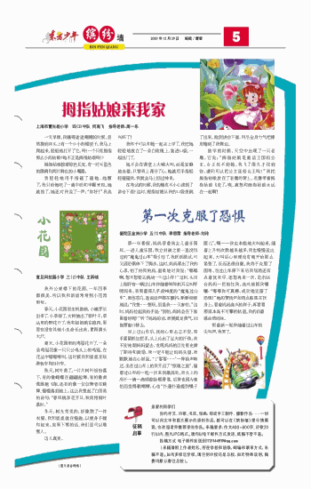 上海市曹光彪小学 四(3)中队 何禹飞 指导老师:周一乐 一天早晨,我睡得迷迷糊糊的时候,忽然摸到床头上有一个小小的银匣子。我马上爬起来,轻轻地打开了它。呀!一个只有拇指那么小的姑娘!她不正是拇指姑娘吗?! 拇指姑娘披着棕色长发,有一对天蓝色的眼睛和两片鲜红的小嘴唇。 我轻轻地用手指碰了碰她,她醒了。我只给她吃了一滴牛奶和半颗米粒,她就饱了。她还对我说了一声:“你好!”我高兴坏了! 我终于可以和她一起去上学了。我把她轻轻地放在了一朵白玫瑰上,装进口袋,一起出门了。 她不会在课堂上大喊大叫,而是安静地坐着。只要我上课分了心,她就用手指轻轻碰碰我,我就会马上回过神来。 在考试的时候,我的橡皮不小心滚到了讲台下面!这时,拇指姑娘从我的口袋里跳了出来。跑到讲台下面,用尽全身力气把橡皮拖到了我脚边。 放学的时候,天空中出现了一只老鹰。它说:“拇指姑娘是童话王国的公主,女王找不到她。我飞了很久才找到你,请问可以把公主还给女王吗?”我把拇指姑娘放在了老鹰的背上。老鹰带着拇指姑娘飞走了。唉,真想和拇指姑娘永远在一起啊!