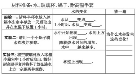 上海市宝山区青少年活动中心 姜奕文 东晋诗人陶渊明在《归园田居·其三》中写道:“道狭草木长,夕露沾我衣。衣沾不足惜,但使愿无违。”他借此表达了他的归隐之心。但你知道吗?为什么夜间会有那么多的露水沾湿了陶渊明的衣裳呢? 今天,就让我们来揭开谜底,一起操控水的变身吧! 请你描述一下常温下水的状态:(在圆圈内打勾,多选) ○液体 ○固体 ○无色 ○有各种颜色 ○没有味道 ○有味道 材料准备:水、玻璃杯、锅子、耐高温手套 注意: 1.水蒸气温度较高,请在家长配合下进行操作。 2.请选用较厚实的玻璃杯,防止温度骤变导致杯子破裂。 小科普: 水随温度的变化 水存在液态、气态、固态三种状态,并且三种状态可以互相转变。当水的温度低于0℃时,水就变成了固态的水(即冰)。当冰的温度高于0℃时就会融化成液态的水。当水的温度高于100℃时就会变为气态的水(即水蒸气)。当水蒸气遇冷,温度低于100℃时就会变成液态的水。 露与霜 空气中水蒸气的含量受温度的控制。气温高时,空气能承载的水蒸气比较多,气温低时则比较少。春秋两季昼夜温差比较大,白天可能会很热,晚上却很冷。所以,空气中因温度骤降而多余的水蒸气就会聚集在树叶、窗户等表面,也就形成了露水。而到了冬天,气温降到零下,水会结冰,挂在叶子上的就不再是露水,而是冰霜了。