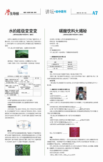 上海市宝山区青少年活动中心 姜奕文 炎炎夏日,当你满头大汗时你最希望得到的是什么?那肯定是一瓶冰镇碳酸饮料啦!咕咚咕咚~~嗝~~一口下去太爽啦但是你了解碳酸饮料吗?今天,就让我们一起来探究一下碳酸饮料的秘密吧! 一、喝碳酸饮料后的打嗝之谜 材料:1瓶可乐、1根火柴 科普: 其实,可乐中存在的不助燃的气体是二氧化碳,你猜对了吗? 当混有大量二氧化碳的可乐液体进入人体后,因为环境压力减小、温度升高,所以二氧化碳气体就跑出来啦!因此,也就出现了“打嗝”的现象。 知识扩展: 二氧化碳还可以使澄清石灰水变浑浊,在化学实验中常常用此方法来判断是否产生二氧化碳。 二、碳酸饮料(非无糖型)的增肥之谜 材料:1瓶可乐、1个小奶锅、1个电子秤 步骤: 1.记录可乐的体积V=____________ml 2.称取奶锅的质量m1=____________g 3.将整瓶可乐倒进奶锅中 4.用中小火煮可乐,煮至液体黏稠,即得到可乐中的糖浆。(可以微微搅拌防止液体喷溅。) 5.待奶锅冷却后,称取奶锅和糖浆的总质量m2=____________g 6.计算一瓶可乐中糖浆的含量c1=(m2-m1)/V=____________g糖浆/ml可乐液体 注意:此处熬出的糖浆是含有高浓度的糖的溶液,虽然能够更直观地看出可乐中的糖,但只能大致估算糖的质量。 下面,就让我们更精确地来计算一瓶可乐中的含糖量吧! 步骤: 1.找到可乐瓶身上的营养成分表中糖的含量c2=____________g/100ml可乐液体 2.计算一瓶可乐中的糖的质量m4=c2×V=____________g 3.请你称取与m4同等质量的白砂糖进行对比。 所以,可乐中的糖多吗?____________ 科普: 糖是导致肥胖的主要原因之一,因为它会部分转化为脂肪储存在人体内。碳酸饮料中的含糖量非常高。一瓶500毫升可乐中的糖就已经超过了世界卫生组织建议的“每天摄入人工添加糖最好不超过25克,一定要控制在50克以内”。 另外,虽然市面上存在很多无糖饮料,但大部分还是添加了甜味剂,如安赛蜜、赤藓糖醇、木糖醇等。作为食品添加剂,过量食用也不利于健康哦。 你还知道碳酸饮料的什么秘密呢?快快告诉身边的小伙伴吧! (提示m:质量;V:体积;c:浓度;g:克;ml:毫升)