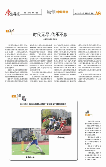 上海市商业学校 程睿佳 小时候我总疑惑,外婆为什么可以一整天都待在那个水墨味的房间——陈列着各式各样木质、竹制的扇骨,在旁边是一叠扇面——上面什么也没有,又好似什么都有。另一边是各色染料,水墨、金丝、玉珠。成品的扇子挂了满墙。 回忆起外婆制扇:她的手如素云般将扇面轻展,拈起如仙蝶般的兰花指,将扇骨、扇面黏合,把玉珠自然地落在扇柄末端。左手把扇,泼洒画意;右手轻舞,落笔两行。 想起那一年,外婆受邀参展后又载誉而归,我翻看她的作品时,发现画的尽是山水、花鸟,对此我很疑惑,感觉与“我的祖国”的参赛主题好像关联不大嘛。 随着我年龄的增长,我越来越感受到我的祖国是具体可感的,是可以依靠的,是足以令我们心生自豪的。她是巍峨蜿蜒的万里长城,是直冲云霄的神舟飞船,是袁隆平为解决国人吃饭问题呕心沥血研发的万顷良田……特别是看到那句——“也许,现在的中国护照还不能带你去世界上任何一个地方。但是,它能从任何一个地方接你回家!”当战争和灾难来临时,祖国的飞机接回原本无助的受困同胞,你会对“祖国”有了别样的感性认识,那是由心底深处升腾起来的骄傲与满足,是对生活在这片土地上的自豪与幸福! 但,我还是没想通外婆的作品如何契合“我的祖国”这个主题。 直到我参加市古诗文阅读大赛,老师引用习主席的一番话来强调古诗文学习的重要性:“这些诗词从小就嵌在学生们的脑子里,会成为终生的民族文化基因。”我似乎有点明白了:困难前阻时,我会想到“山重水复疑无路,柳暗花明又一村”;失意沮丧时,“何妨吟啸且徐行”回荡在耳畔;懒惰懈怠时,“莫等闲,白了少年头”犹如鞭策。诗词歌赋中的传统文化潜移默化地滋养着我们的身心,影响了一代又一代人。那这样看来,带给外婆一生幸福美好的手艺是不是也像古诗词一样呢?她画的梅兰竹菊代表的是正直、无畏、谦逊、文雅,是中国传统的文化意象和精神财富。原来,外婆高兴的不只是她的手艺得到人们的赞赏,而是传统的文化瑰宝得到人们的接纳与认可。 当祖国用各方面成就向世界展示经济稳定发展的硬实力时,精神世界的提升也尤为重要,而这与祖国优秀传统文化的传承密不可分。因为这是我们民族发展的根本,是习主席所认为的“最深厚的软实力”,是祖国能日新月异、长久发展的有力保证。近年来,汉服的复兴让更多年轻人了解并感受到属于中国传统服饰文化的独特魅力;故宫博物院的文创产品深受人们喜爱,这为故宫文化的传播推波助澜;“诗词大会”更是燃起了大家学习诗词的满腔热情……我相信,这些优秀传统文化的弘扬必将丰富人们的精神生活,推动整个社会的健康发展。 现在,我有时也会像外婆一样流连在那间满是墨香的房间,试着向更多朋友宣传和推广,用自己的努力一点一点完成她的心愿。