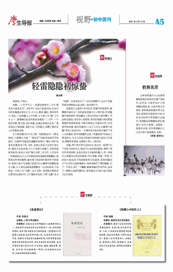梁永刚 春雷响,万物长。 惊蛰,二十四节气之一。惊蛰也被称为二月节,顾名思义就是农历二月的节日,但也不是绝对的,比如今年的惊蛰就出现在正月。古人云,蛰者,藏也。寒冷的冬天,昆虫、小动物藏入土中冬眠,古人称之为“蛰”。《月令七十二候集解》是这样描述惊蛰的:“二月节……万物出乎震,震为雷,故曰惊蛰,是蛰虫惊而出走矣。”意思是说大地回暖,春雷乍动,万物重生,惊醒了蛰伏在土中冬眠的动物。 古人将惊蛰15天分为三候:“初候桃始华,二候仓庚鸣,三候鹰化为鸠。”“桃始华”的意思是桃花开始盛开,“仓庚鸣”的意思是黄鹂开始鸣叫,“鹰化为鸠”的意思是鹰变成了鸠。当然,动物之间是不会相互变化的,鹰也不会变成鸠,古人只是看不到鹰了,发现鸠逐渐多起来,就误认为是“鹰化为鸠”。在古代,人们还有一种错误的认识,认为冬眠的动物是被春雷震醒的。按照现在科学的解释,蛰伏地下的动物们根本听不到雷声,春回大地天气变暖才是把它们从睡梦中唤醒的真正力量。古人受百虫被春雷震醒这一认识的误导,于是将这一天称之为“启蛰”。这个名称一直用到汉朝皇帝汉景帝刘启的时代,为了避皇帝名讳,才将“启蛰”改为“惊蛰”。后来虽经历了一次次改朝换代,但由于惊蛰听起来更响亮生动,因此一直沿用至今。 惊蛰是什么意思?有句俗话“惊蛰节到闻雷声,震醒蛰伏越冬虫”,说的就是惊蛰日天上要打雷,听到隆隆作响的雷声,那些藏在土里过冬的虫子就苏醒了,开始拱出地面。受好奇心的驱使,每年的惊蛰日里我期望着能听到滚滚春雷,可每次都是以失望而告终。没有雷声的惊蛰,能叫惊蛰吗?小虫子又怎么从睡梦中惊醒?等我上到初中时,一位博学多识的老师才解开了我心头的谜团,原来我国幅员辽阔,“惊蛰始雷”的说法主要指南方,北方尤其是中原地区的惊蛰日是很少打雷的,要想听到春雷,还要耐心等上一段时间。 惊蛰,两个再平常不过的汉字,组合在一起便产生了奇妙无穷的含义,构成了生动活泼的画面,演绎了美好传奇的故事。这是汉语言文字独具的魅力,用一种简约之美铺设出深远的意境。可以想象,惊蛰一声雷,为冰封大地送来了热闹缤纷和生机盎然,昏昏欲睡的万千生灵在尘封的幽暗中,欣欣然睁开了惺忪睡眼,打了一个哈欠,伸了一下懒腰,踏着春暖花开的节拍,迎来了一缕缕久违的明媚阳光,那种重见天日的亢奋之情是无以言表的。